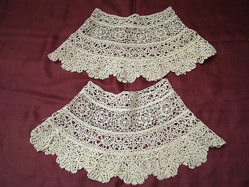 Comments: A Maltese shawl collar. 3 layers; outer edge of alternating Maltese crosses and woven leaf grids, middle layer basically flower roundels, neckline ‘C’ shaped guipure.