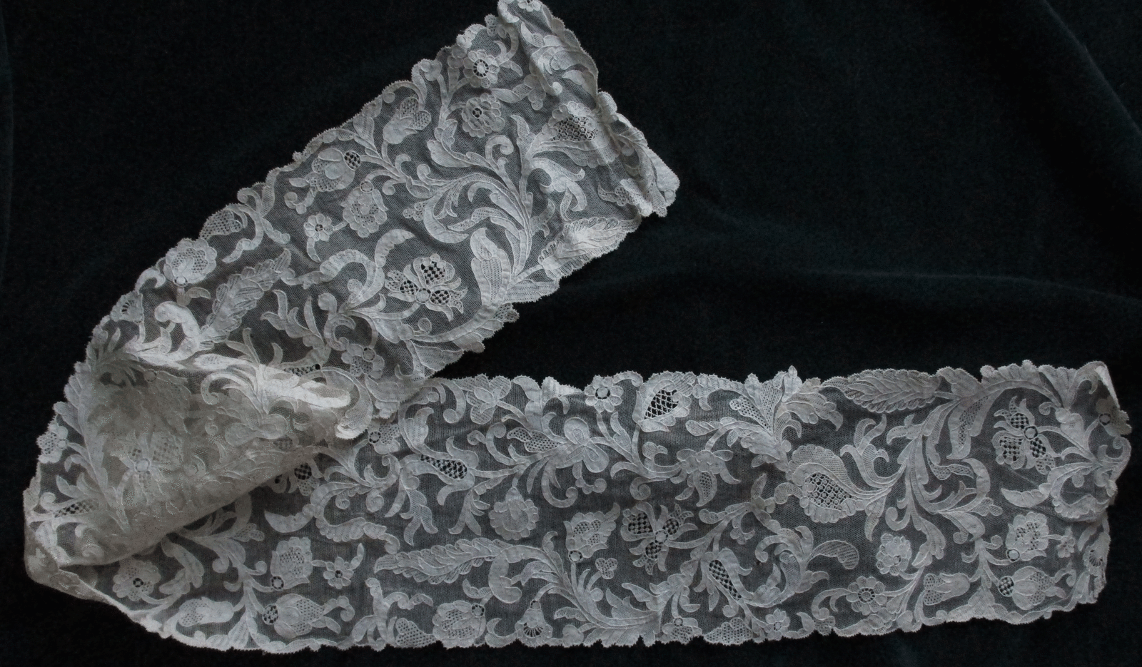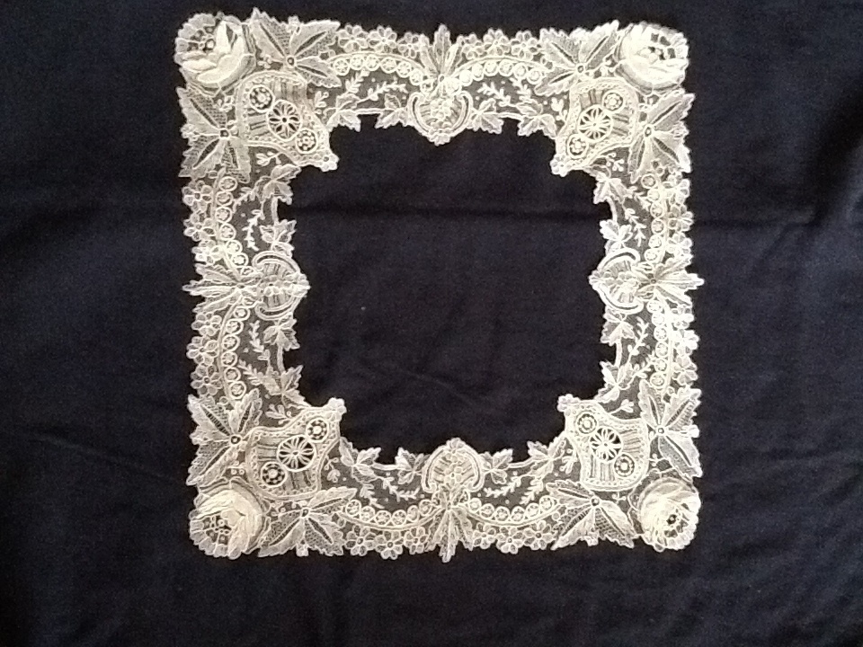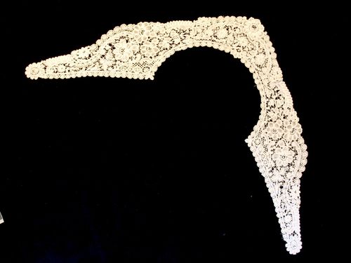 Comments: A bertha of a Belgian pieced lace, perhaps Bruges Bloemwerk. The motifs are a bit more elaborate than is normally found, but the technique is familiar. Plaited, picoted brides with the typical ‘islands’ where they join. There is some nice decoration in the clothwork in some of the flowers.