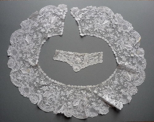 Comments: A collar of Brussels Duchesse with pointed ends. I think the only needlelace are the decorative ‘mode’ fillings just where the front neckline comes together. The bobbinlace does have some good raised work. The design is a bit crowded, but it’s a nicely made piece.