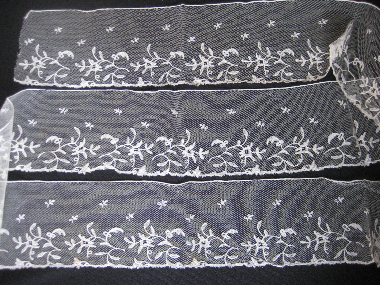 Comments: Brussels bobbinlace applique on machine net. It’s a simple middle-market design. Note the extra touch with the small sprigs in the upper ground, and lots of raised edges on the motifs.