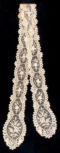 Comments: A short lappet scarf or tie of Brussels bobbinlace appliqued on machine net. Good pattern, filling the space well. A few small needlelace rings used as fillings, and perhaps as esprits in the tulle. Nice picot work all around the edges. Not a really sophisticated design, but it has a very nice presence.