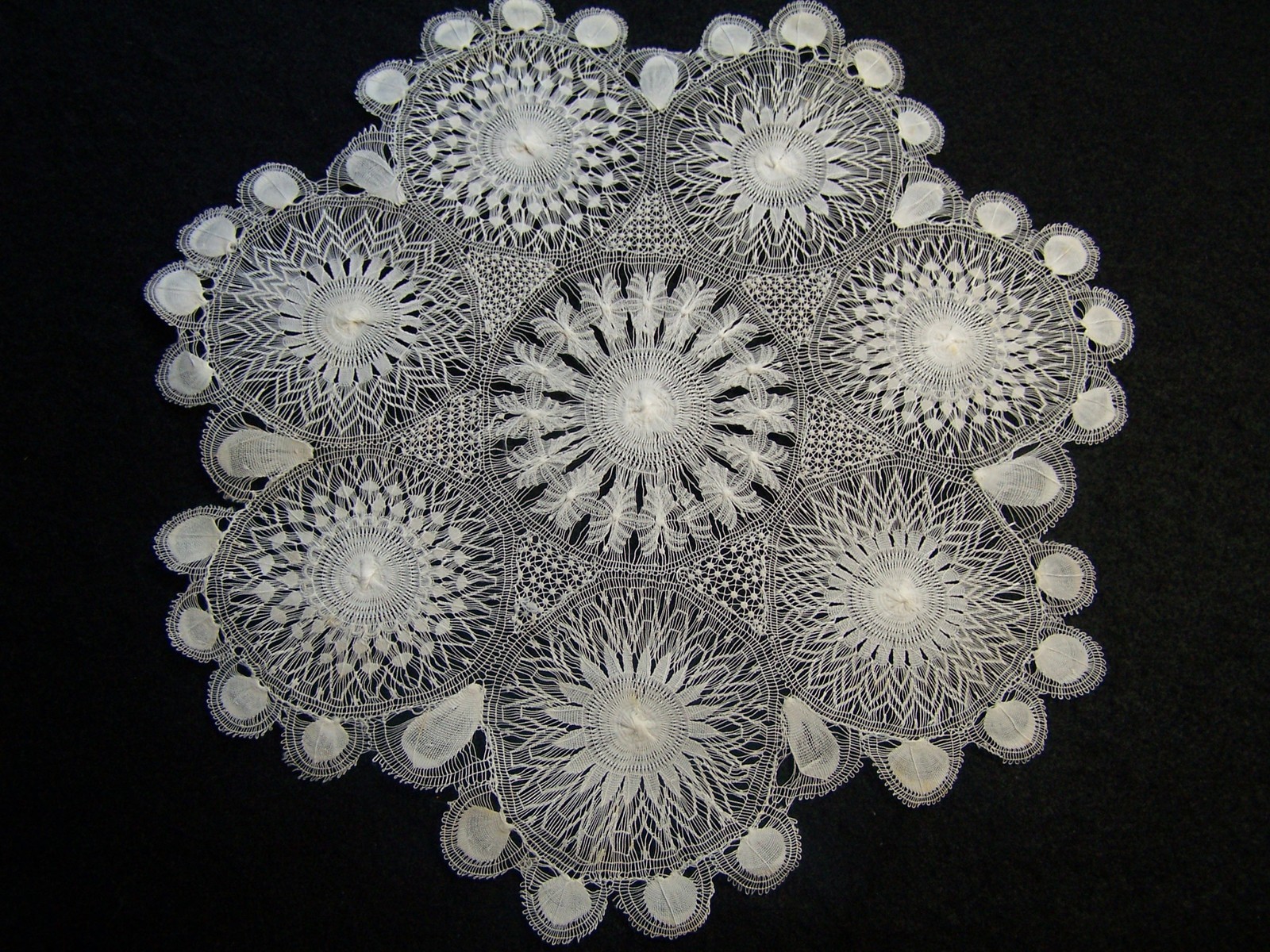 Soilage: Raised work on some of the bobbinlace flowers looks twisted, might be a sign of past washing.