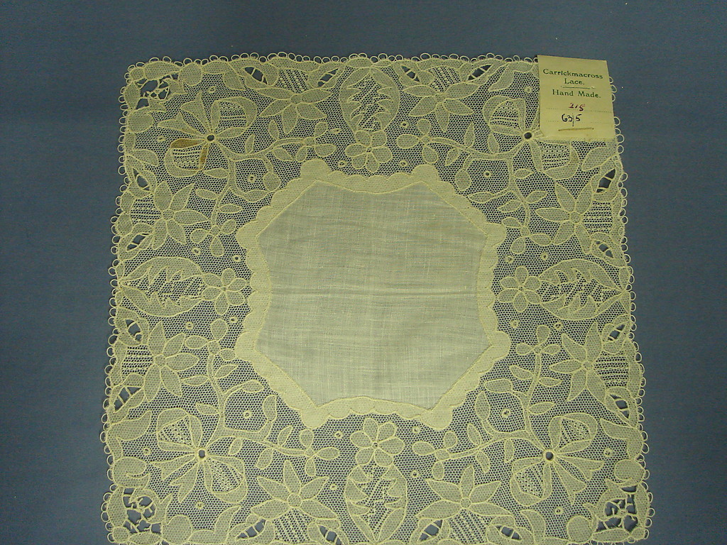 Comments: A modern Carrickmacross handkerchief – you could buy these in the US in the past few decades. It is a very light muslin appliqued on machine net, with some needlerun fillings.