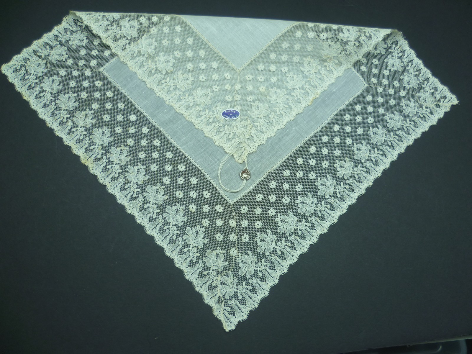 Comments: A handkerchief with an interesting quoted history. It says it was purchased at the Royal School of Needlework in London (original box is included), and there’s a metal seal which usually indicates the place it was made. I don’t recognize the emblem on the seal. The lace itself looks like a French Lille, and there is a sticker saying ‘Made in France’. The lace itself has been cut to fit the corners. I’m guessing that the lace might be older, but the hankie itself is of more modern manufacture.