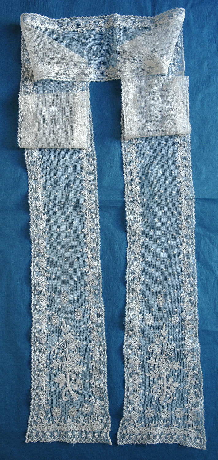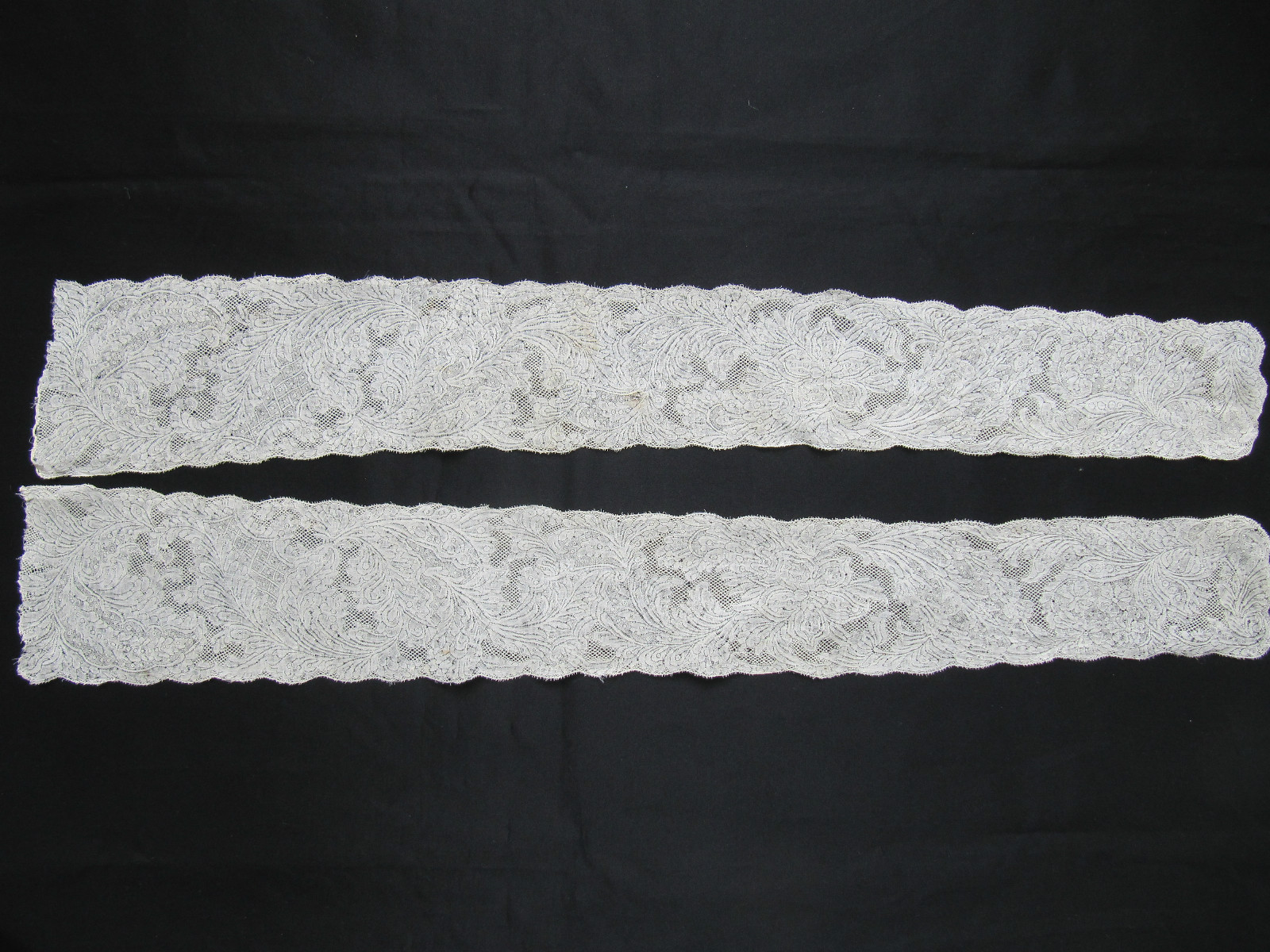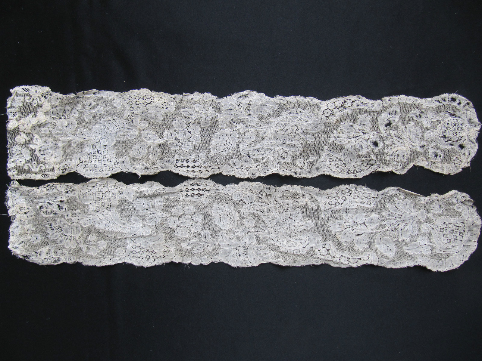 Comments: Two lappets of Mechlin, ~1750. Interesting typical Louis XV design, actually quite elaborate. Varied fillings, good naturalistic floral design. Echos past glories of this lace.