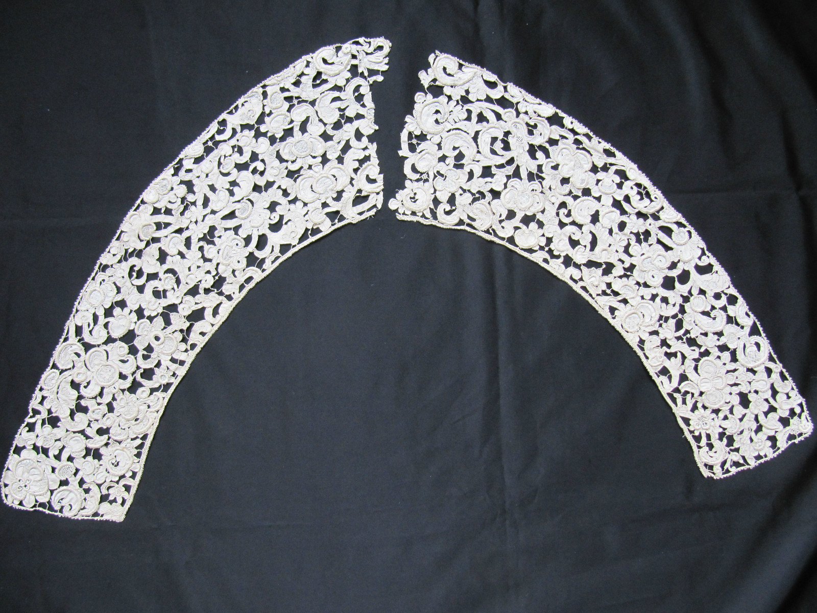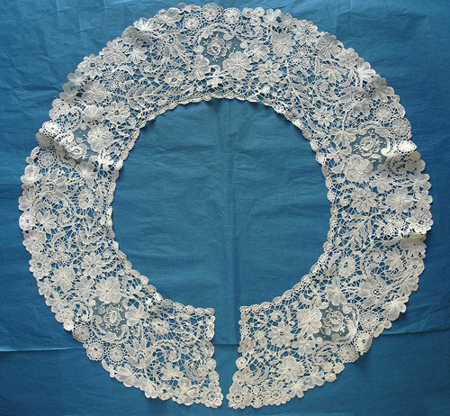 Comments: A bertha of Duchesse de Bruxelles. Raised petal roses in the Point de Gaze inserts. The bobbinlace is a little flat looking, more on the Bruges side. It has a nice scattered flower garden look with just enough asymmetry in the repeats to be quite charming.
