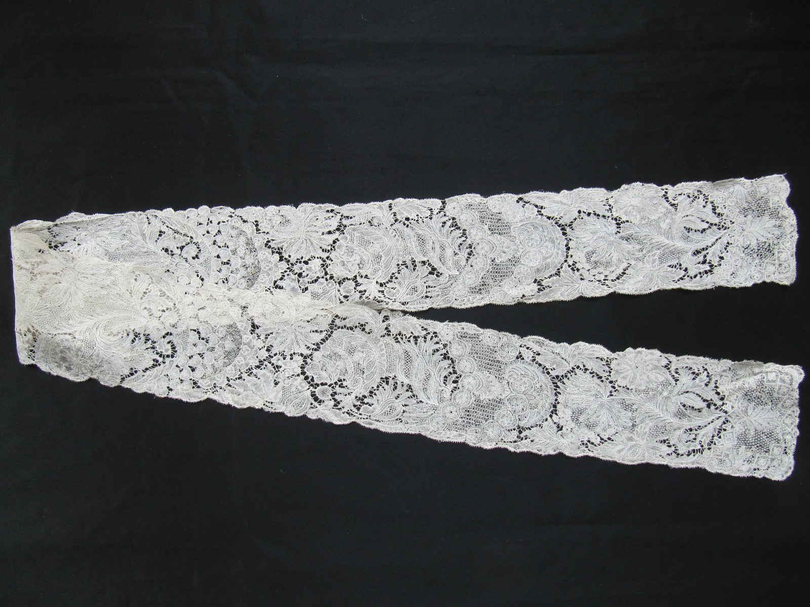 Comments: Two lappets of Brussels bobbinlace with brides – ~1720. Joined at the top ends. Good snowflake fillings, also a kind of filling that forms geometric patterns with tiny tallies. Raised edges are used to emphasize the design, not just indiscriminately. Great design of elaborate flowers and cornucopia.