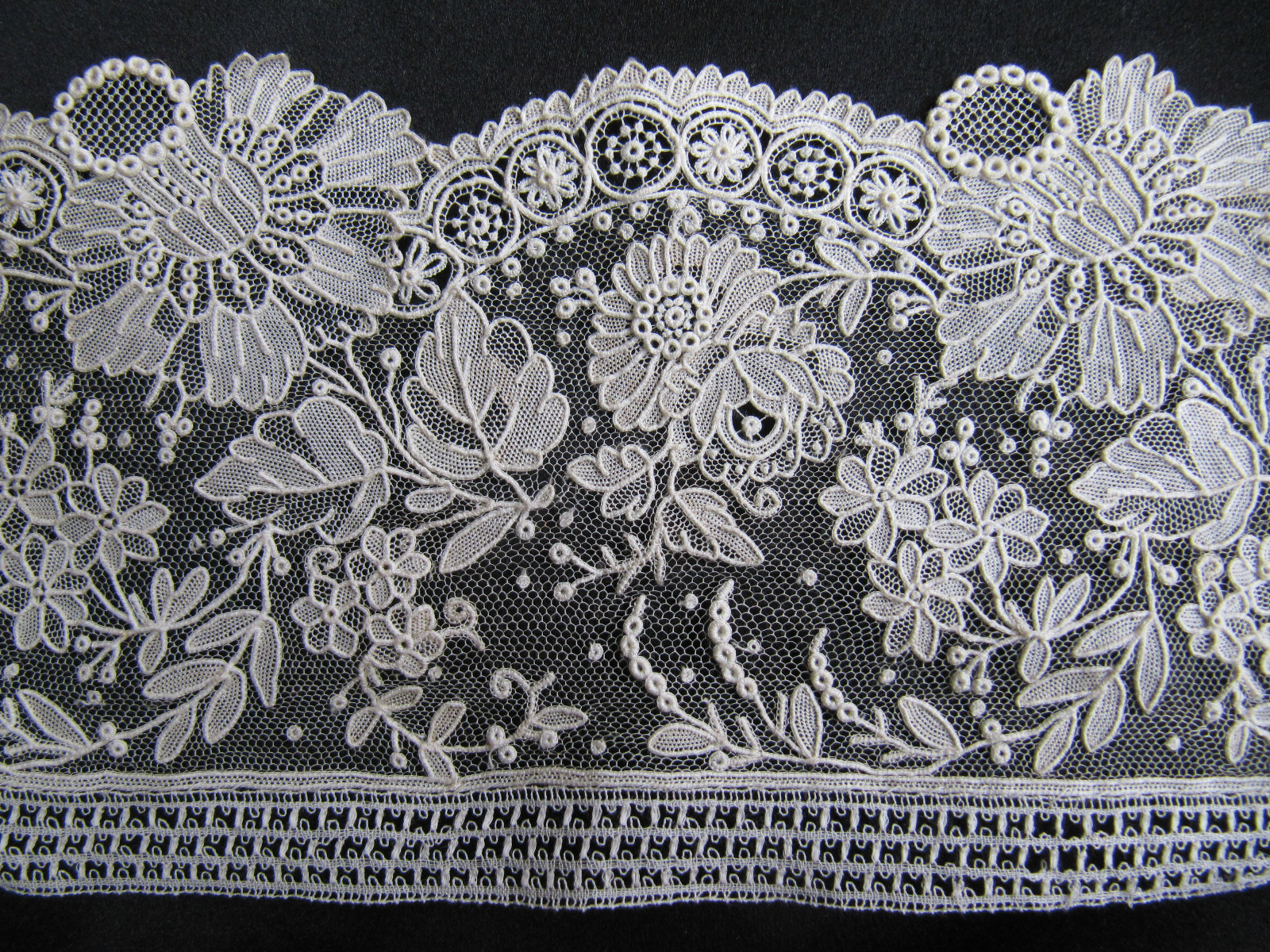 Comments: Three borders of the same Valenciennes pattern. They have a very fine rectangular mesh; wish there were some extreme closeups so I could look at that in more detail. The clothwork is dense and very regular – an impressive technique.