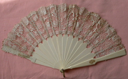 Comments: A fan of Youghal needlelace. Fans in this lace are quite rare. Note the bone sticks with a gold monogram inlay. The whole piece does look a little odd, as if the ‘fuente’ (trying to use correct terminology) is a little too large. I wonder if these sticks have been cut down at one point, but there’s no closeups of the back side in order to tell. The lace design is very typical of Youghal, with well defined foliage and some interesting fillings. Note the unusual lower border of the lace.