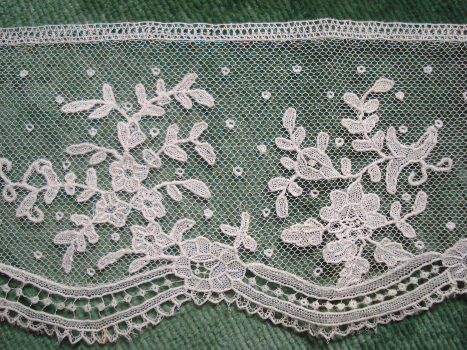 Comments: Two short border sections of Brussels bobbinlace application on machine net. Good delicate pattern with a short repeat of two flowers, nicely worked. Esprits in the ground. This is a lace meant to be ruffled.