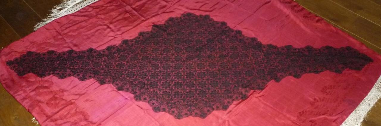 Comments: A black silk Maltese mantilla – an asymmetric diamond shaped headpiece with lappet ends. It has a rather typical design – the outer border is an alternating pattern of flowers and Maltese crosses. Inside is a ‘cloth-like’ pattern consisting of rows of medallions of crosses surrounded by small flowers of woven leaves. Intervening spaces are filled with diamond-shaped patterns of woven leaves.