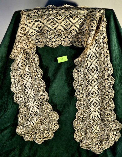 Comments: A Maltese narrow scarf, two part construction, much like the previous review. Outer edge is a serious of flower roundels. The is a solid mat of woven leaf tallies, interrupted by the guipure leaves and crosses at the ends.