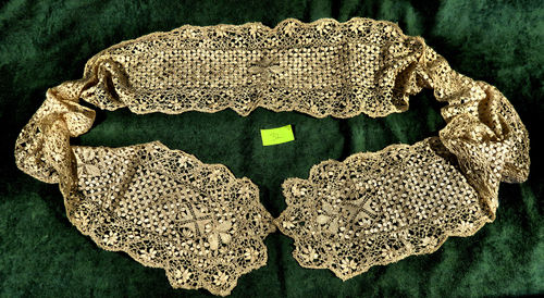 Comments: A Maltese narrow scarf, two part construction. Outer edge is a serious of flower roundels. The inside is a row of guipure Maltese crosses with a few woven leaf flower accents. The Cross roundel at the ends is also made separately, with an inner cross surrounded by an outer row of woven leaf ‘X’s’.
