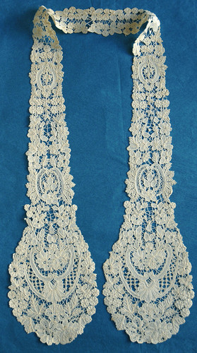 Comments: Mid 18th c Mechlin lappets, joined at the top ends. Typical Louis XV design, just a little plain with the large areas of clothwork. They do have some varied fillings, snowflakes, and some interesting bars on the outer edges just above the ends. Typical quatrefoil decorations that are often found in Mechlin are included on a halfstitch background.