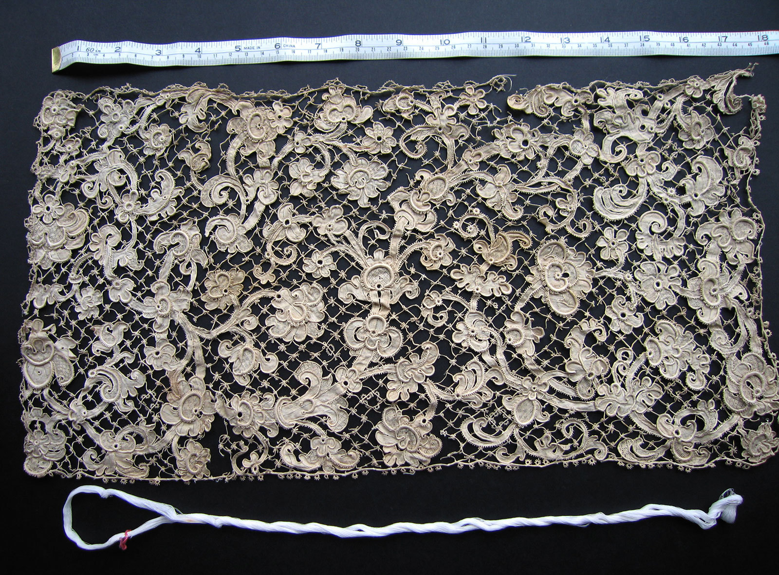 Comments: I’ll call it a Punto Milano – Flemish bobbinlace with a needle-made ground. There was a lot of this made in the later 19th century. The motifs on this are fairly simple, a kind of vine and trefoil pattern. Fairly fast to make, and you can do large pieces.