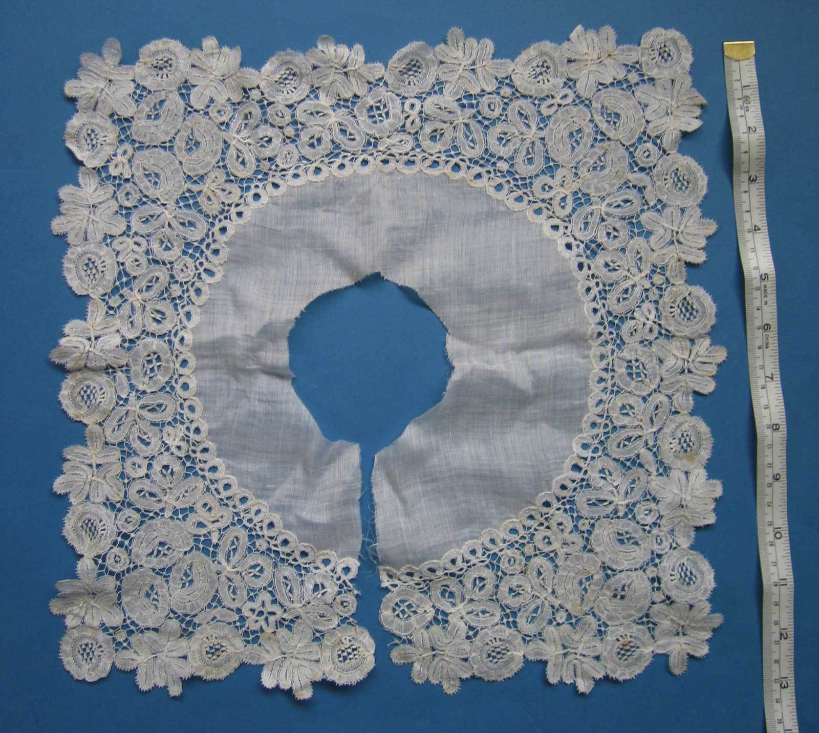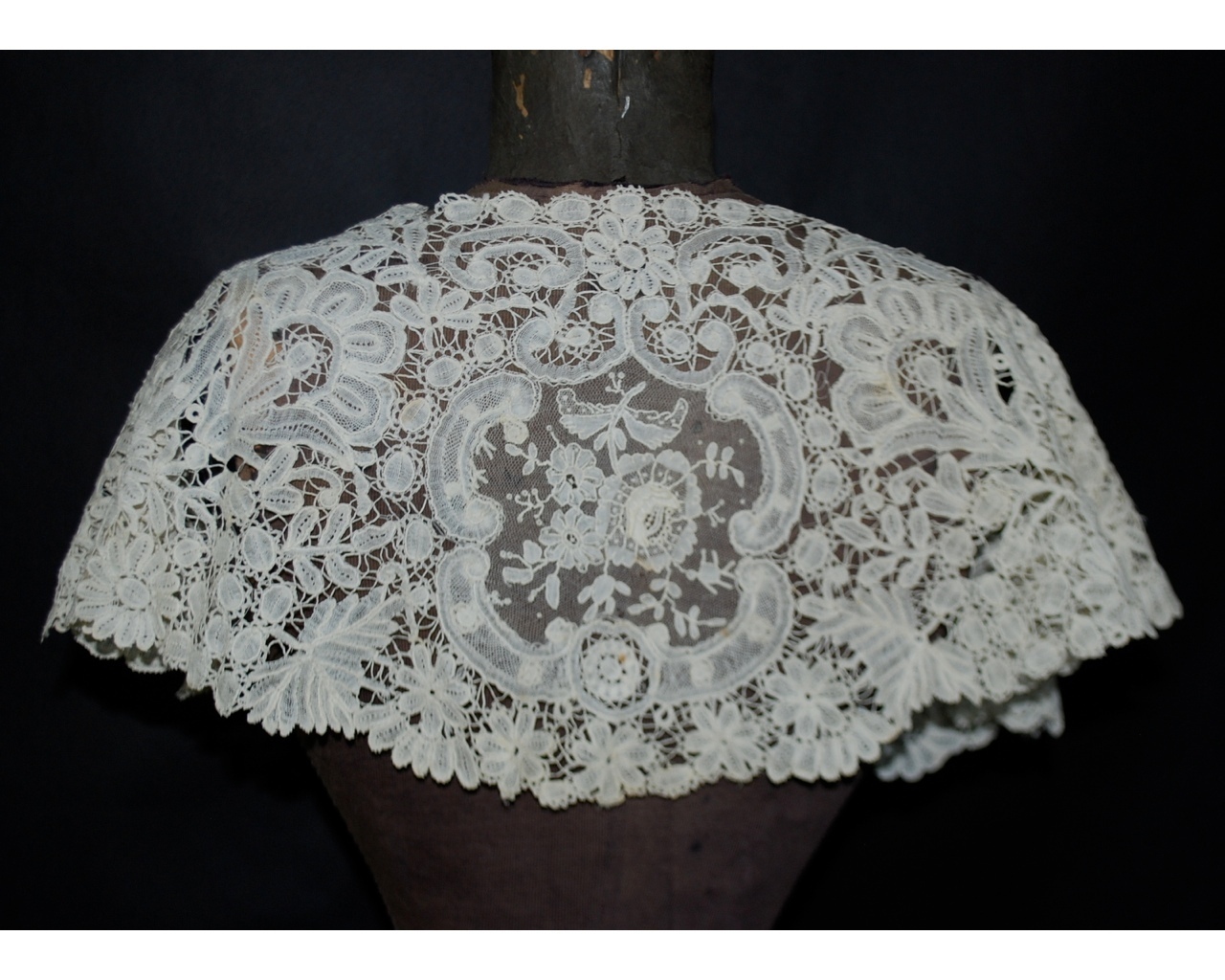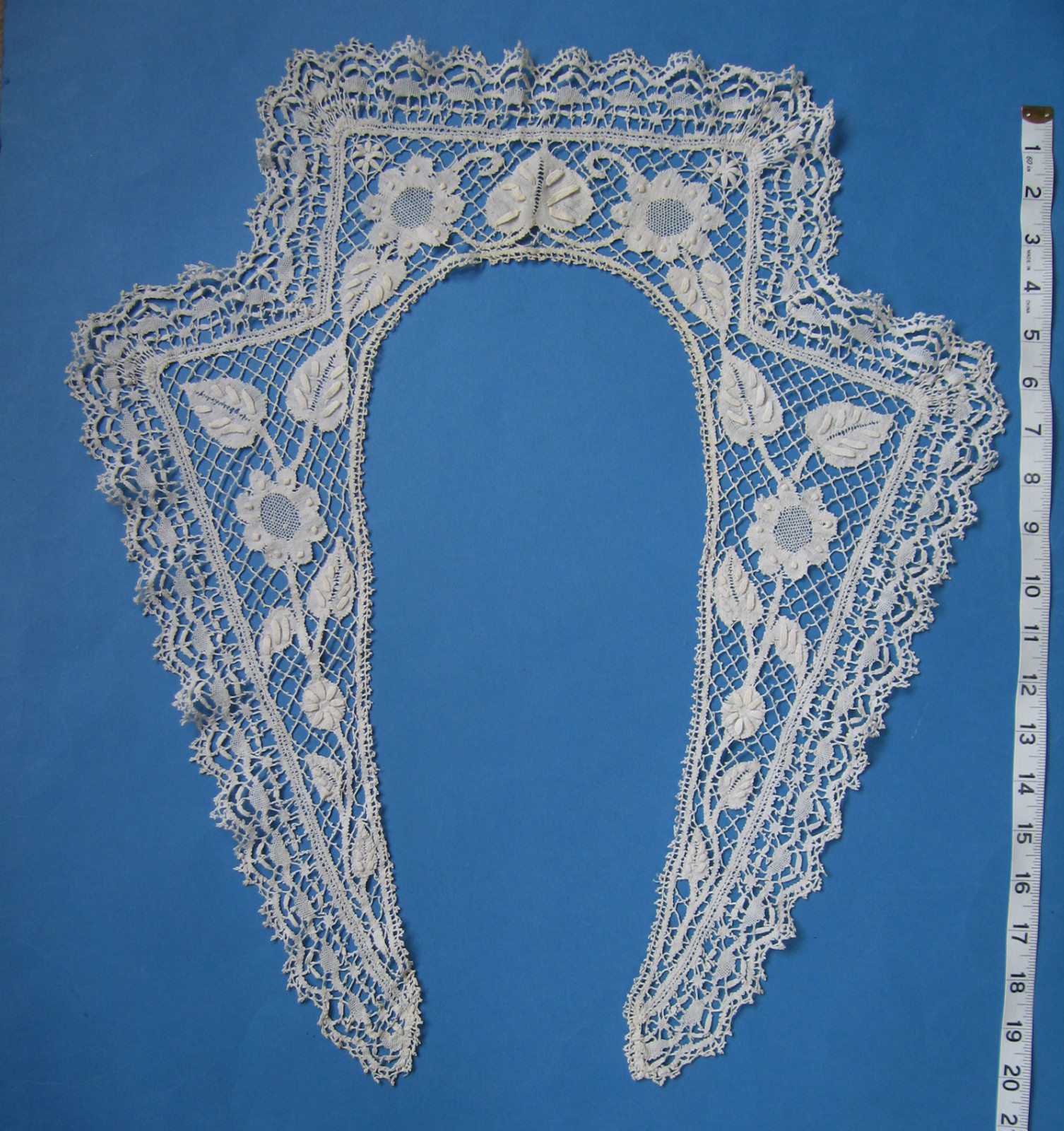 Comments: A shawl collar of Duchesse de Bruxelles with raised petal roses in the Point de Gaze inserts. Two of the inserts have only decorative ‘mode’ fillings – unusual. The bobbinlace has some good raised work. Overall a typical Duchesse design.