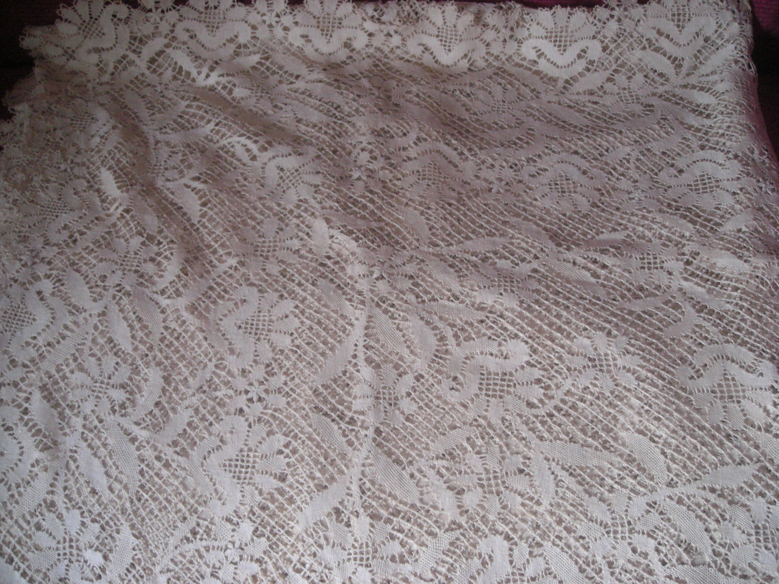 Comments: This is described as a bobbinlace tablecloth or bedspread. You can see very little of it, but it does look like a well done Italian Guipure. Quite sturdy, plaited picoted brides, a few flower centers of woven leaves. It certainly is a large piece, looks well made, but without adequate photography or description, very hard to tell anything else.