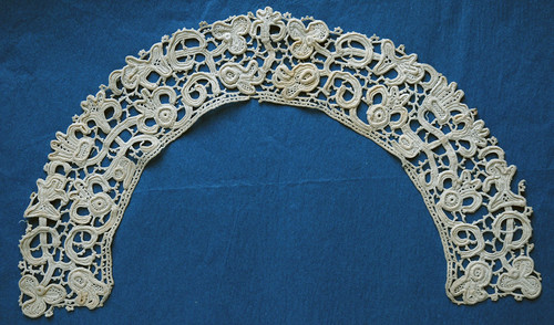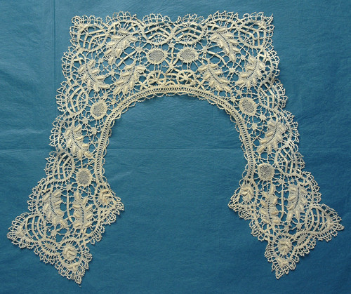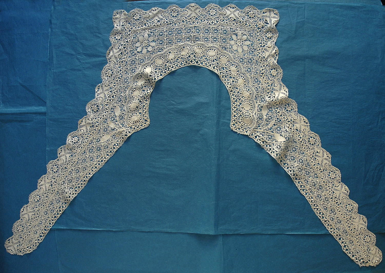 Comments: A Maltese collar with long front points. 3 part construction. Outer border alternating Maltese crosses and flowers. Inner portion some wire ground in a rectangular pattern, and good guipure work in the collar corners and at the front neck points. Neckline is a row of sun motifs edged with crossed woven leaves which continue down the front.