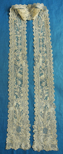 Comments: A Maltese lappet scarf – two part construction. Both inner and outer parts are alternating flowers roundels with a square grid of woven leaves. All these alternate across the piece as well. One Maltese cross at each end. Looks like silk from the closeup photos.