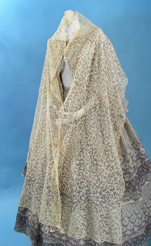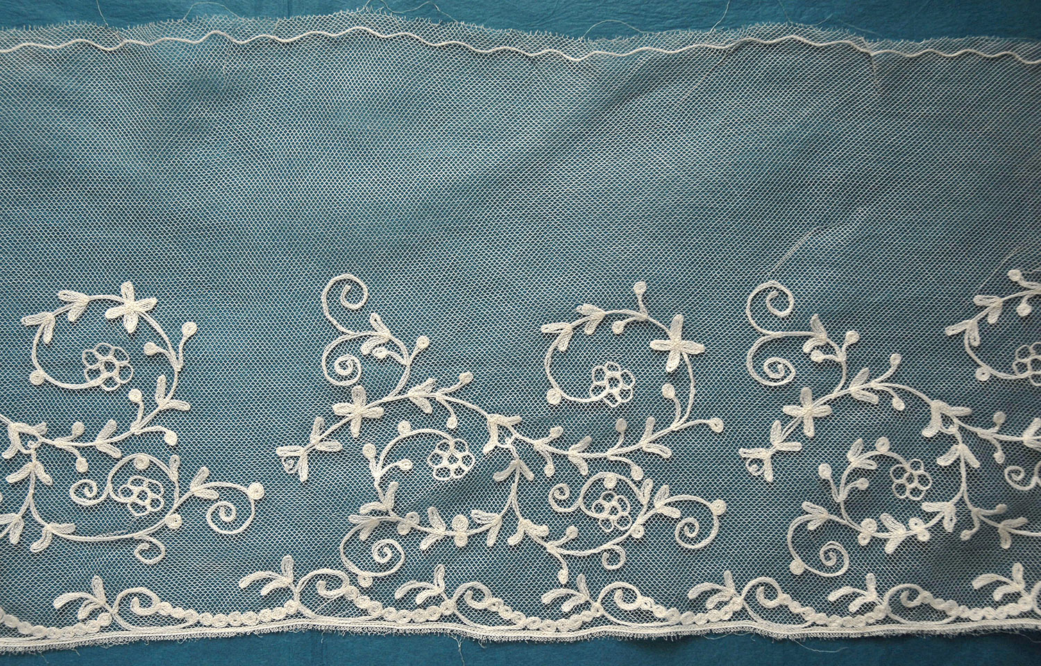 Comments: A very long, deep flounce of needlelace applique on machine net – note the scalloped edge. Difficult to see the pattern given the way the photos are done, but the motifs seem fairly simple, and there are no esprits in the ground. The net drapes quite nicely.