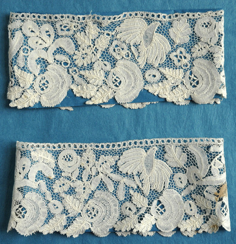 Comments: Two cuffs of Honiton Point with figural elements, birds along with typical flowers and leaves. Looks like they were made as cuffs and not adapted from a border. A little bit on the snail/slugs side, but not too much. The flowers are a bit more varied than one finds in s/s.
