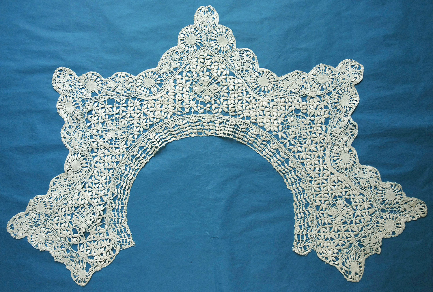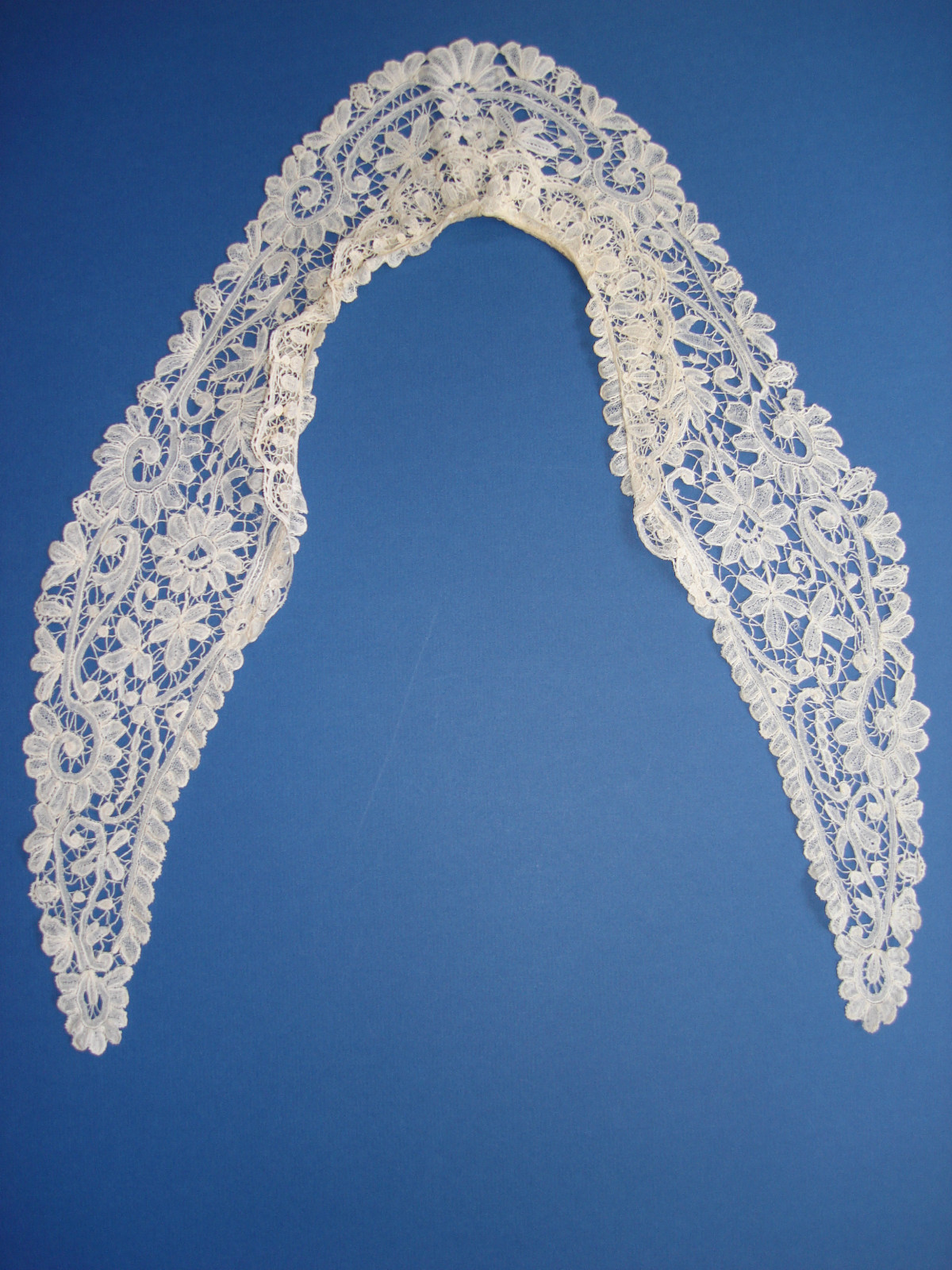 Comments: A collar of Duchesse de Bruges. Long front points, and a separate narrow border added around the neck as a frill. No raised work, conventional motifs, irregular picoted plaited brides.