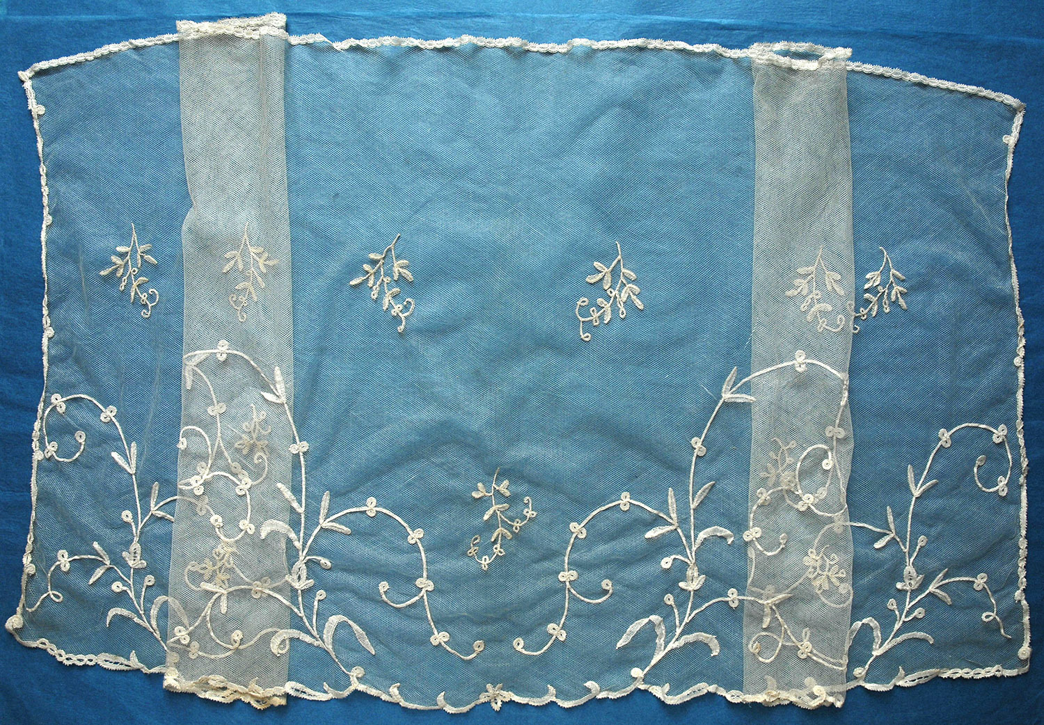 Comments: A rectangular scarf of embroidered net. The embroidery looks needlerun, very closely done with a heavier thread. This gives it an appearance almost like appliqued cloth. The tulle is like that white heavy supple stuff you often find in English work.