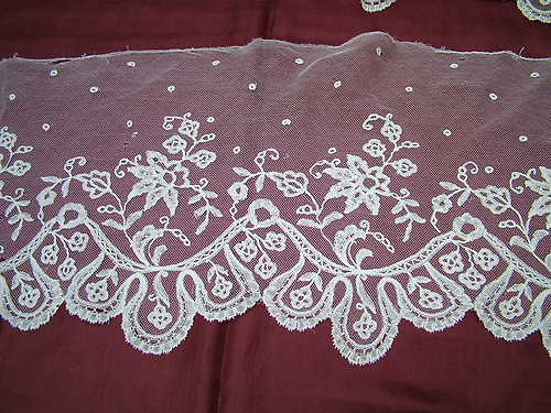 Comments: A border of Brussels bobbinlace applique on machine net. No needlelace that I can see. Motifs are a bit large, note also the rings used as esprits in the round.