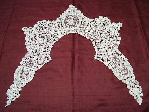 Comments: A collar of Brussels Duchesse with long front points. 3 inserts of Point de Gaze with raised petal roses. Conventional pattern, note the scalloped edges. Some raised work on halfstitch background in the bobbinlace.