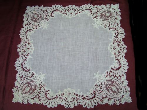 Comments: A Brussels Duchesse handkerchief. The ovals in the corners contain a flat Point de Gaze, rather unusual design. Just a simple flower surrounded by some thin looking almost like a laurel wreath, and a few lines of decorative rings serving as leaves. The bobbinlace has conventional Duchesse motifs, note the deep points going into the center cloth at the ends.