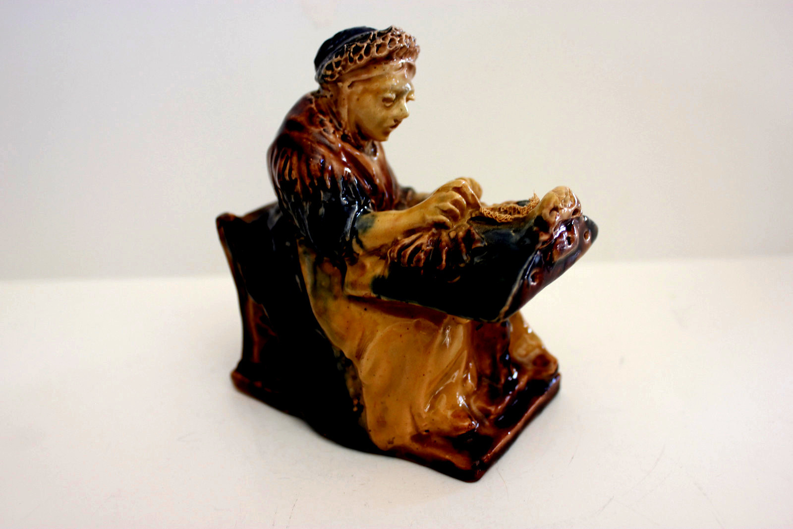 Comments: A Flemish Pottery lacemaker (see http://tinyurl.com/4baktku). Looks like one of the smaller Vande Voorde figures. Note there’s an actual piece of lace on the pillow. Vande Voorde made many sizes of this figure, and might claim to be the first Flemish pottery to produce it. His mother was a lacemaker.