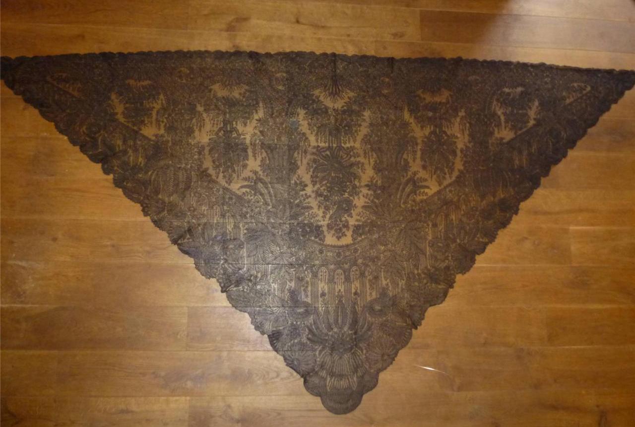Comments: A black Blonde mantilla, the form is a little unusual with the very wide lappet ends. Note the combination of both linen and half stitch, along with some tally grids used as fillings. Might be a French Blonde-de-Caen product made for the Spanish market.