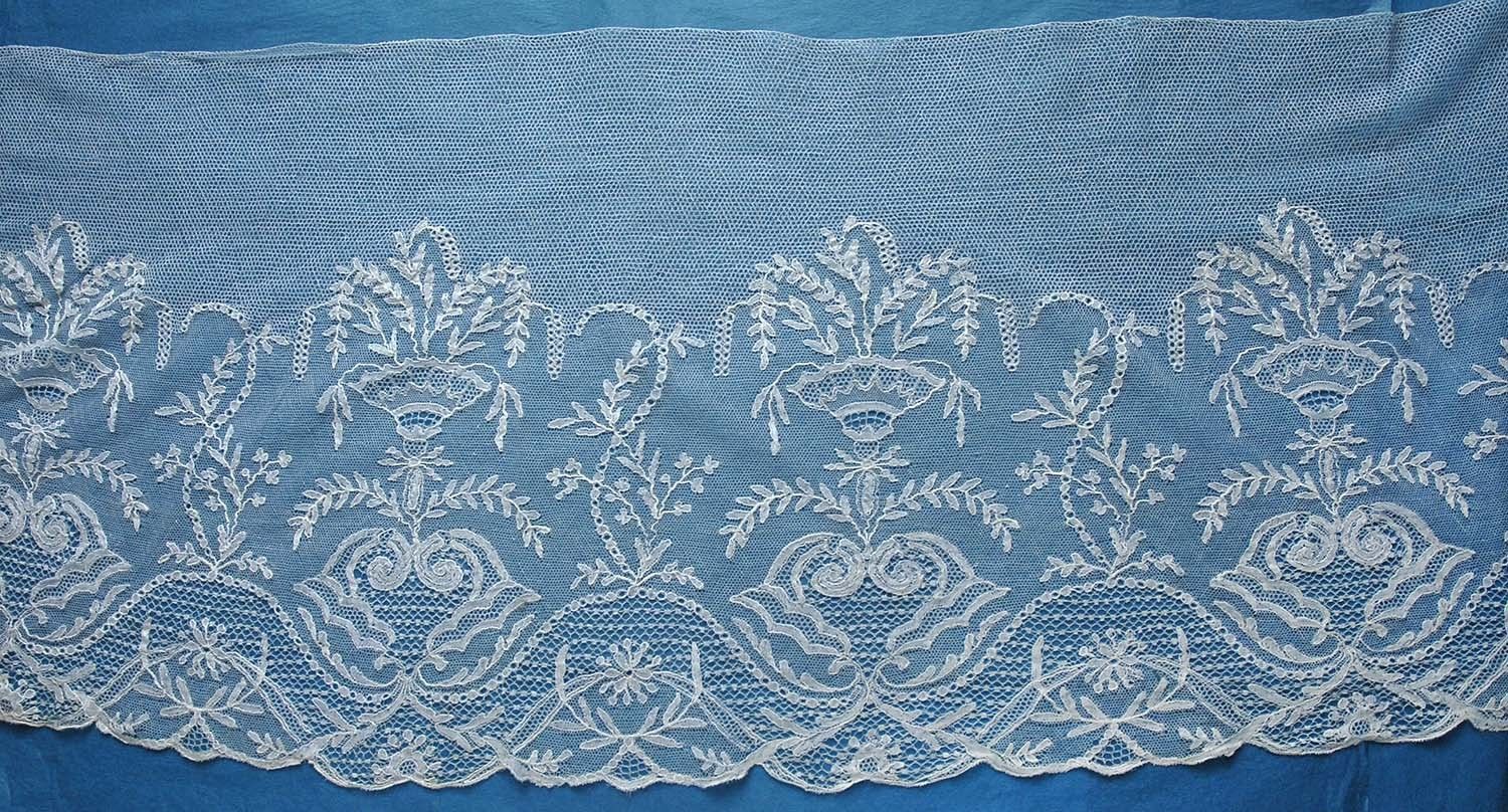 Comments: A flounce of embroidered net, needlerun with shamrock designs. Which points to Limerick. Borders of this are fairly unusual. The design is a little simple, two main flower sprays form the repeat. There are a few esprits close to the lower border.