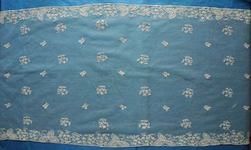 Comments: A long, wide point ground lace, although that only applies to the bottom. The wide blank area at the top is Kat stitch. I think it’s Bucks, basically because of the extensive fillings along the bottom edge – you usually don’t see these wide areas filled like this in Lille. Seller gives a provenance, but best to write and ask for more details.