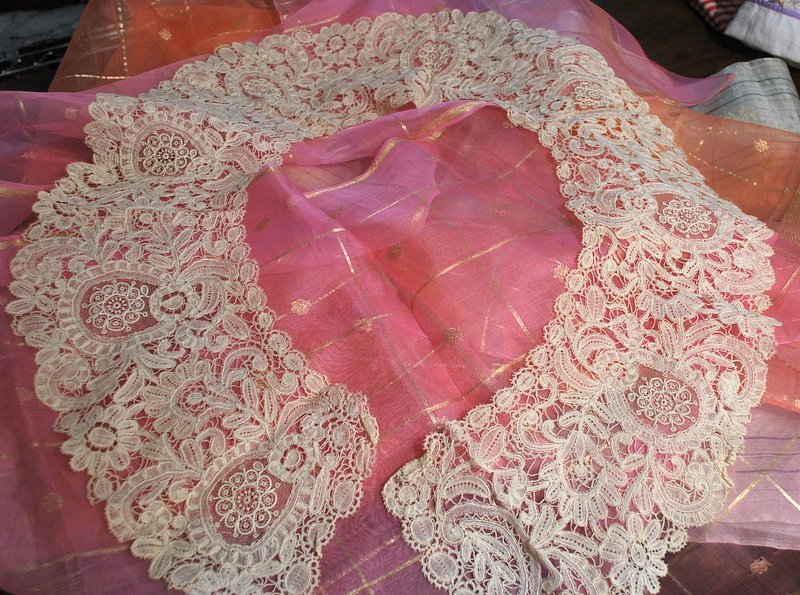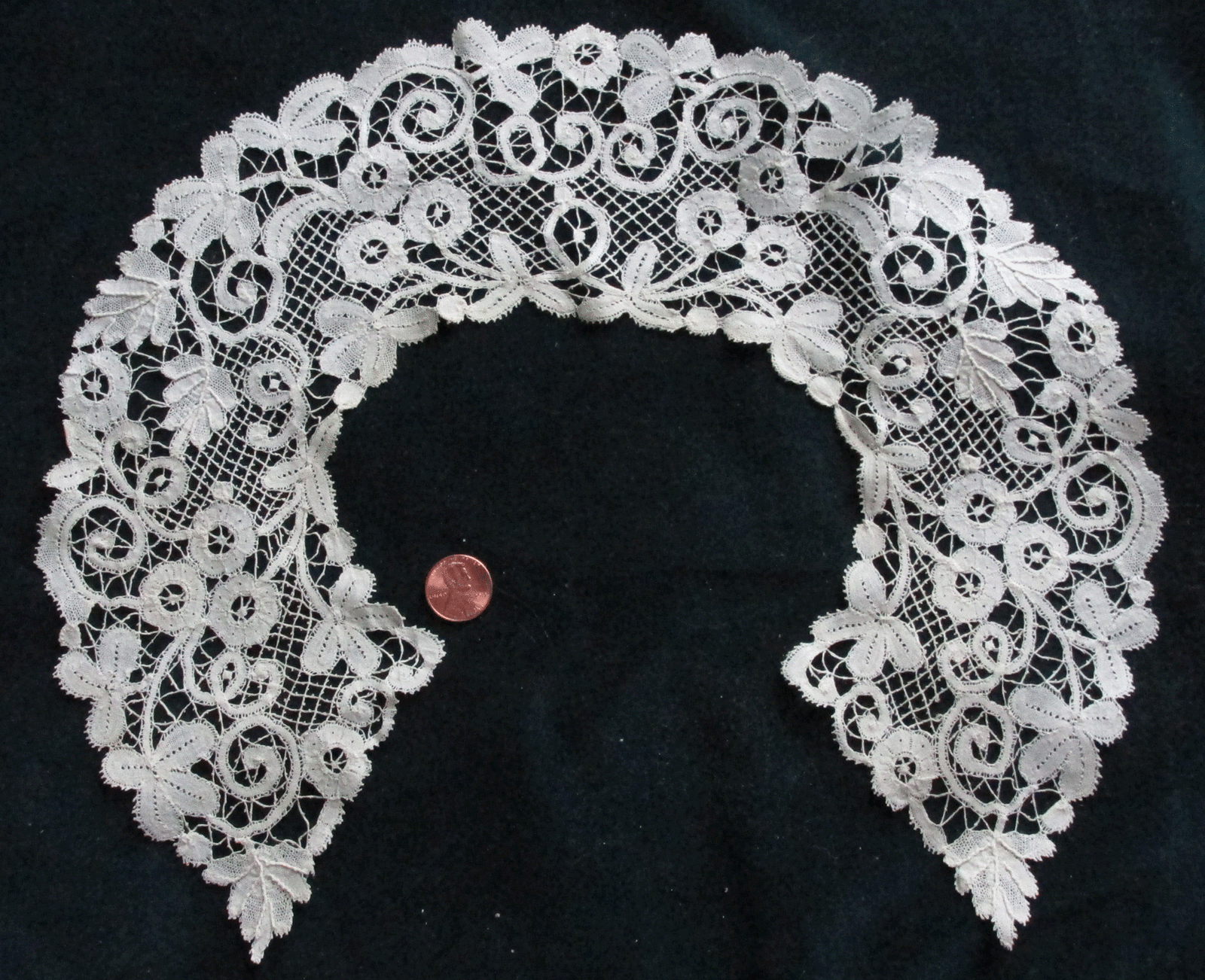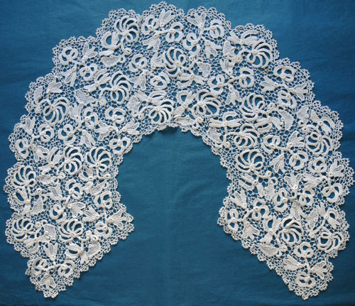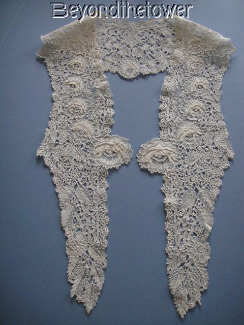 Comments: A Point de Gaze collar with long front points – note the projecting roses meeting in the center. Several of this style collar have come up for sale in the last few years, and the are usually quite high quality. Raised petal roses, two layers, arranged almost in a garland around the neckline. There are some areas of Point de Gaze mesh, but much has no mesh; one of those ‘Point de Gaze guipure’ pieces. Interesting outside border on the roses, like it’s wrapped, not buttonholed.
