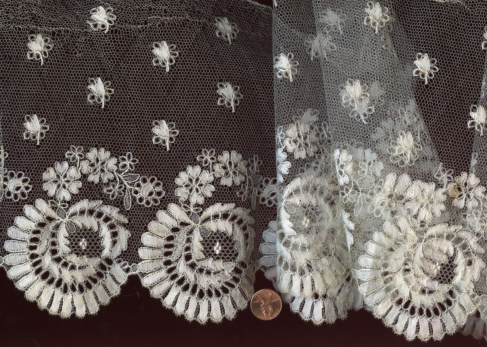 Comments: Louis XIV Mechlin lappets, joined at the tops. Design is interrupted where they are cut. These lappets are in exceptional condition. There are also some variations of typical Mechlin quatrefoil fillings, some almost modified to diamonds.
