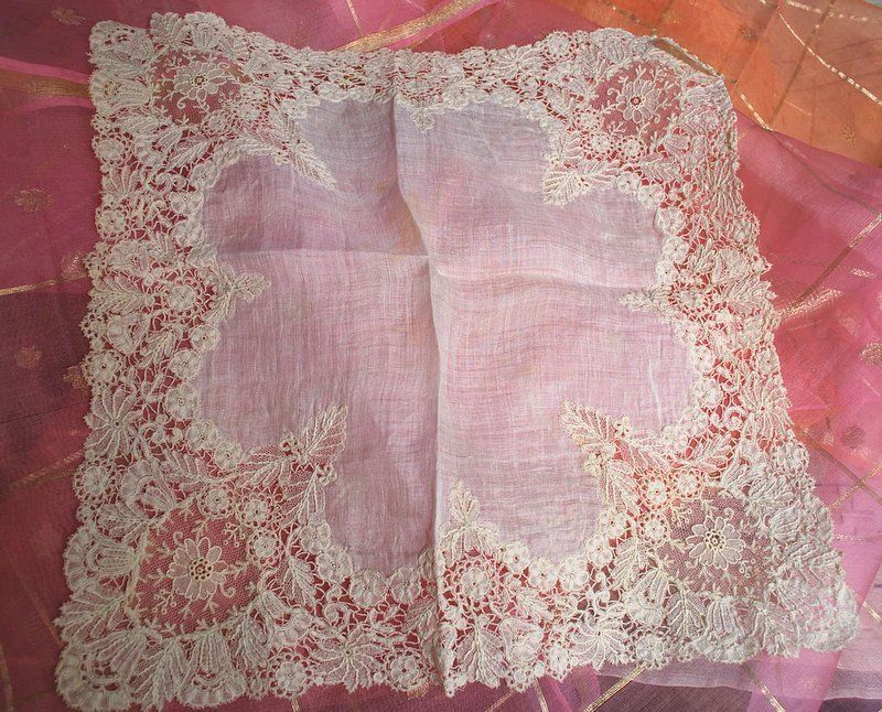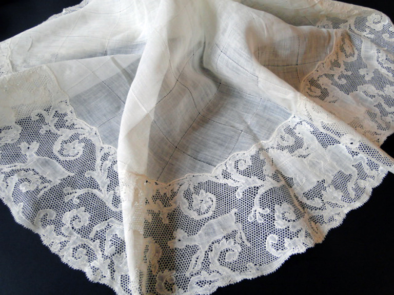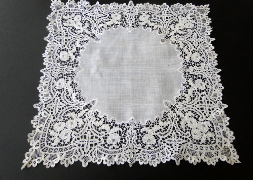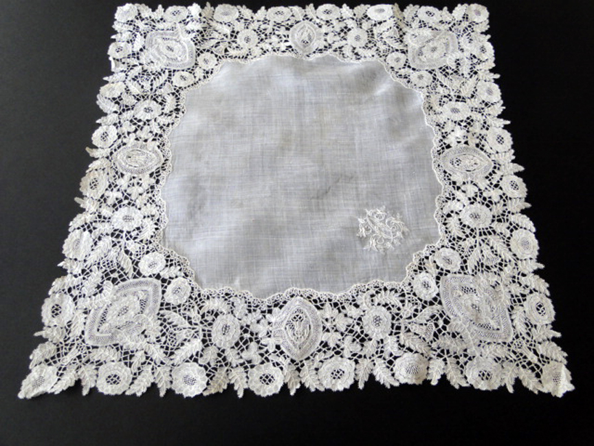 Comments: A Duchesse de Bruxelles handkerchief. No raised petals in the Point de Gaze inserts. It’s kind of a wild floral design, rather densely packed.