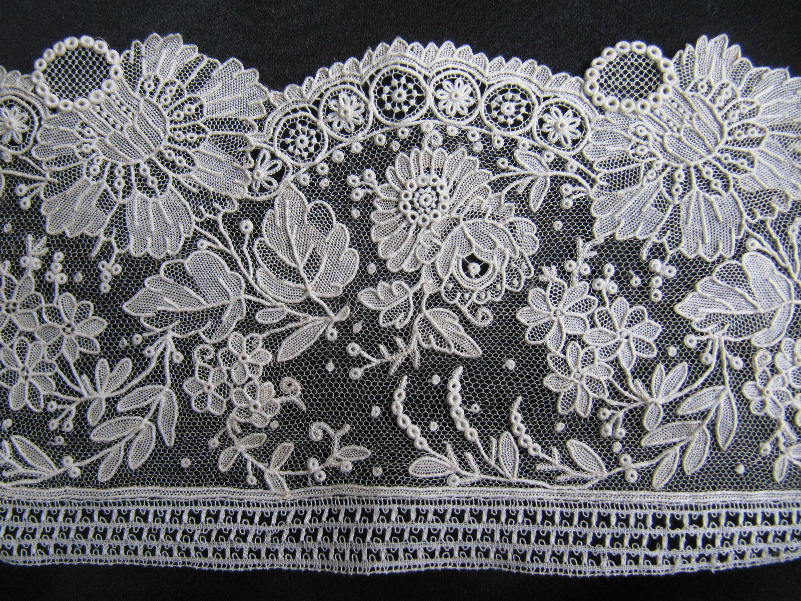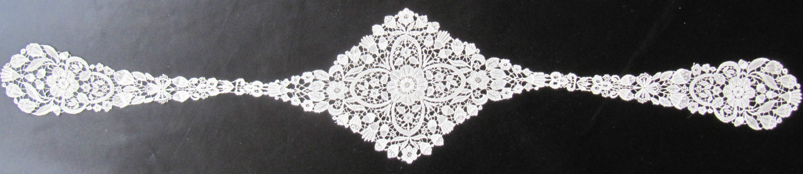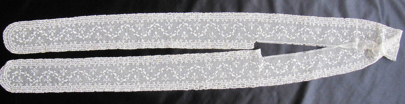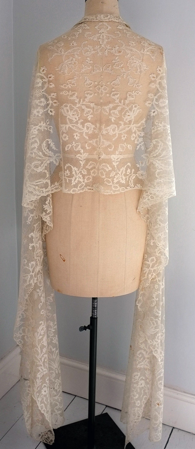 Comments: A lappet scarf of Brussels bobbinlace application on machine net. Some tiny needlelace accents in flower centers., and there are two rather large needlelace flower at the lappet ends. The bobbinlace is small and delicate, quite well made, raised rolls and edges. Good naturalistic design, note wave of flowers along the connecting band. Not the highest quality of this lace, but getting there. Small, good pieces of applique like this aren’t too common.