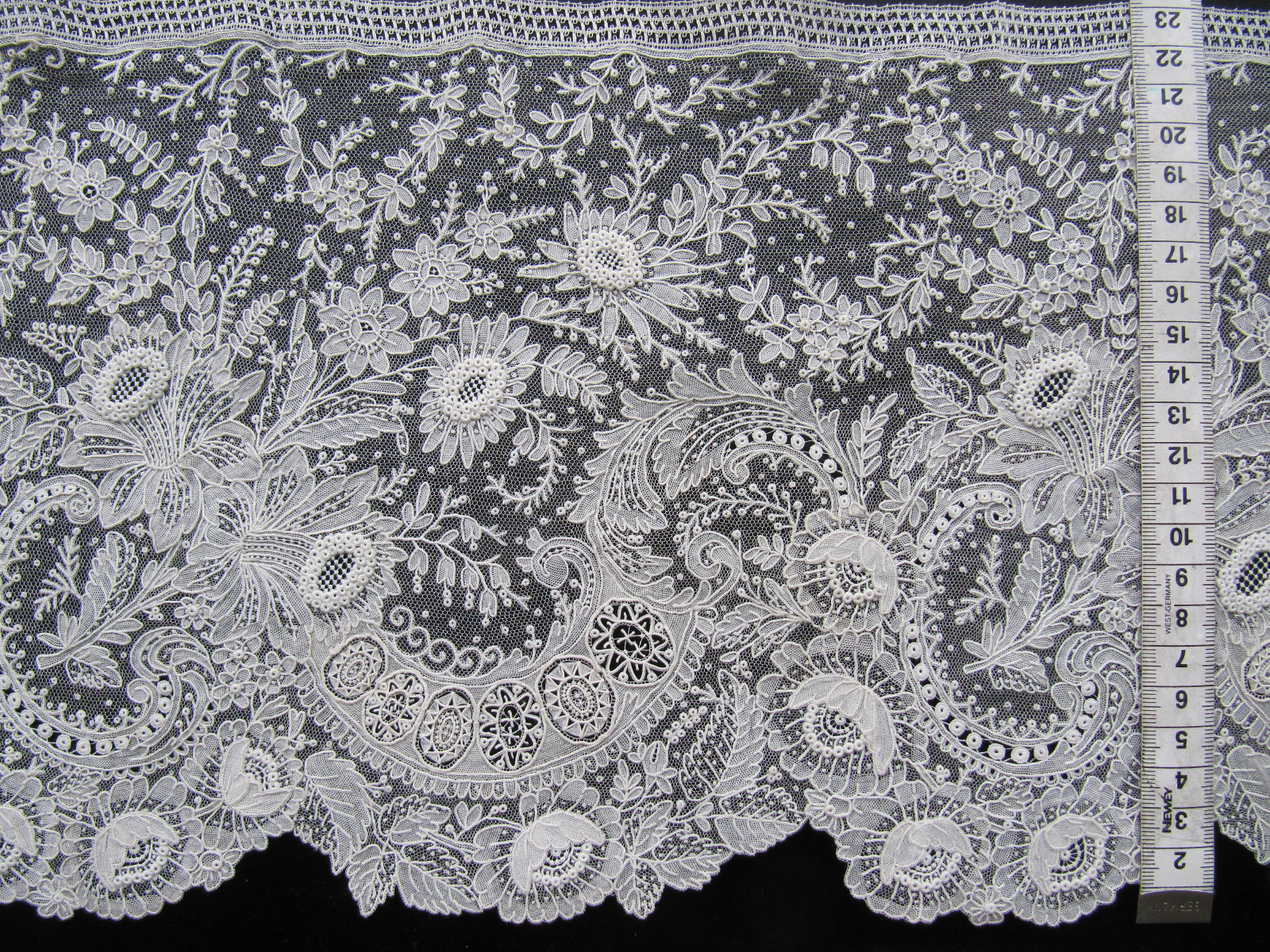 Comments: A fairly deep border of Blonde de Caen, from France. This lace is famous for the contrast of the heavy motifs and the very light mesh, which can also be its undoing in condition. Here the design fills the space quite well, it is meant to hold a slight ruffle. Note the elaborate esprits in the ground, and some extra effort to contrast the heavy border with lighter small halfstitch leaves. also note the little diamonds in the centers of the honeycomb areas, which is a bit unusual.