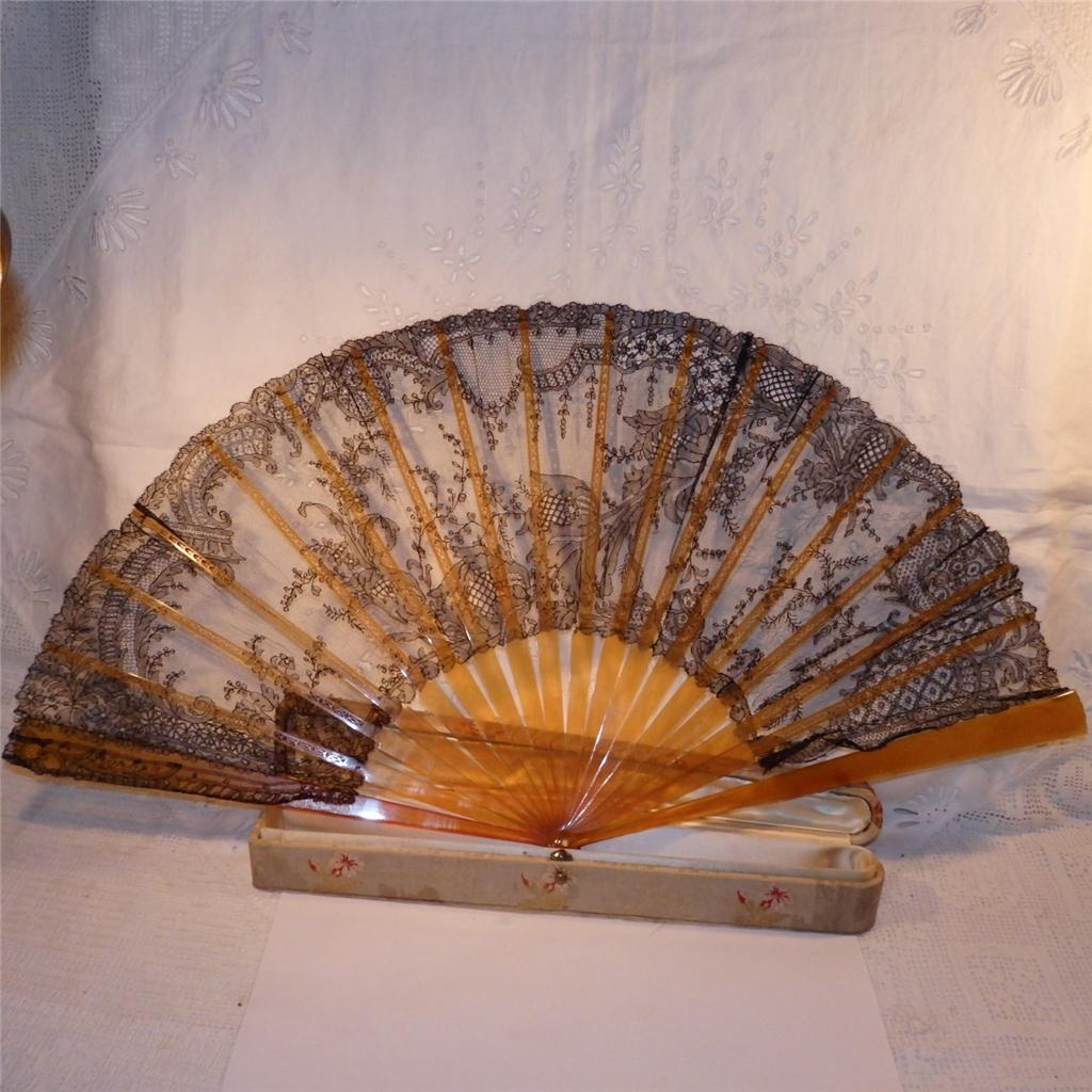 http://tinyurl.com/l6kkxbm AN ANTIQUE FRENCH EVENTAIL FAN..J. DUVELLEROY ..LONDON & PARIS.. BLACK LACE