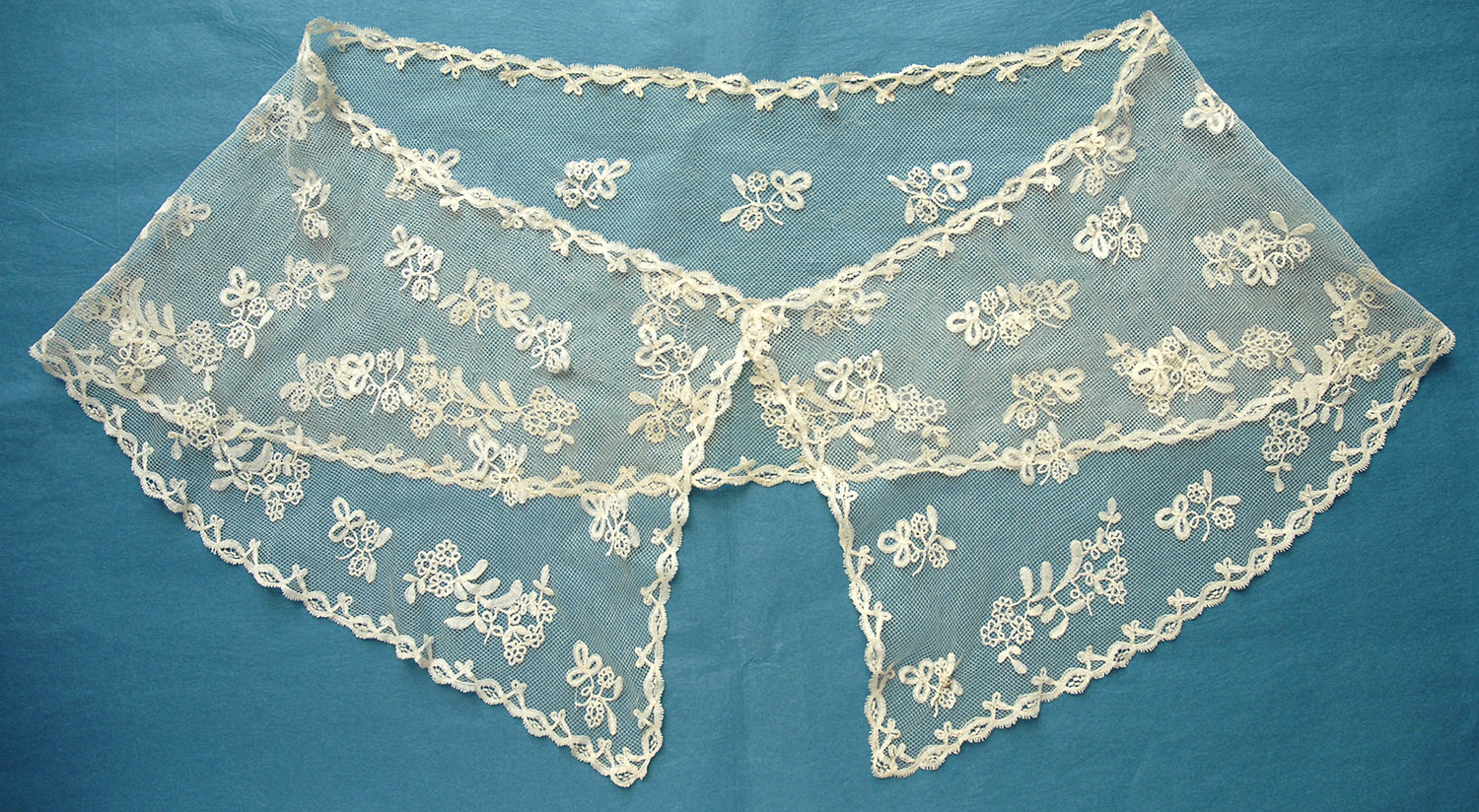 Comments: I’m not sure if this is a bertha, but it looks good draped around the shoulders of the manikin. Honiton applique on machine net. It has large motifs, without much in the way of typical Honiton fillings – a bit snails/slugs style. Some larger sprigs along the lower border, smaller ones in the upper ground. Nice consistent small border around all edges. A middle market product.