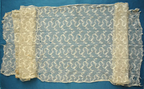 Comments: Ex. coll. Pat Earnshaw. A wide border of bobbinlace which has been made in strips so it is likely early 19th c, perhaps English. The ground is Kat stitch. You can see the strips sewn together clearly in this piece. Whether this is an assembled piece, or originally meant to be like this is the question. Something like this bears a little resemblance to Levey’s “A History of Lace”, plate 344, described as an early French blonde. Interesting, puzzling piece.