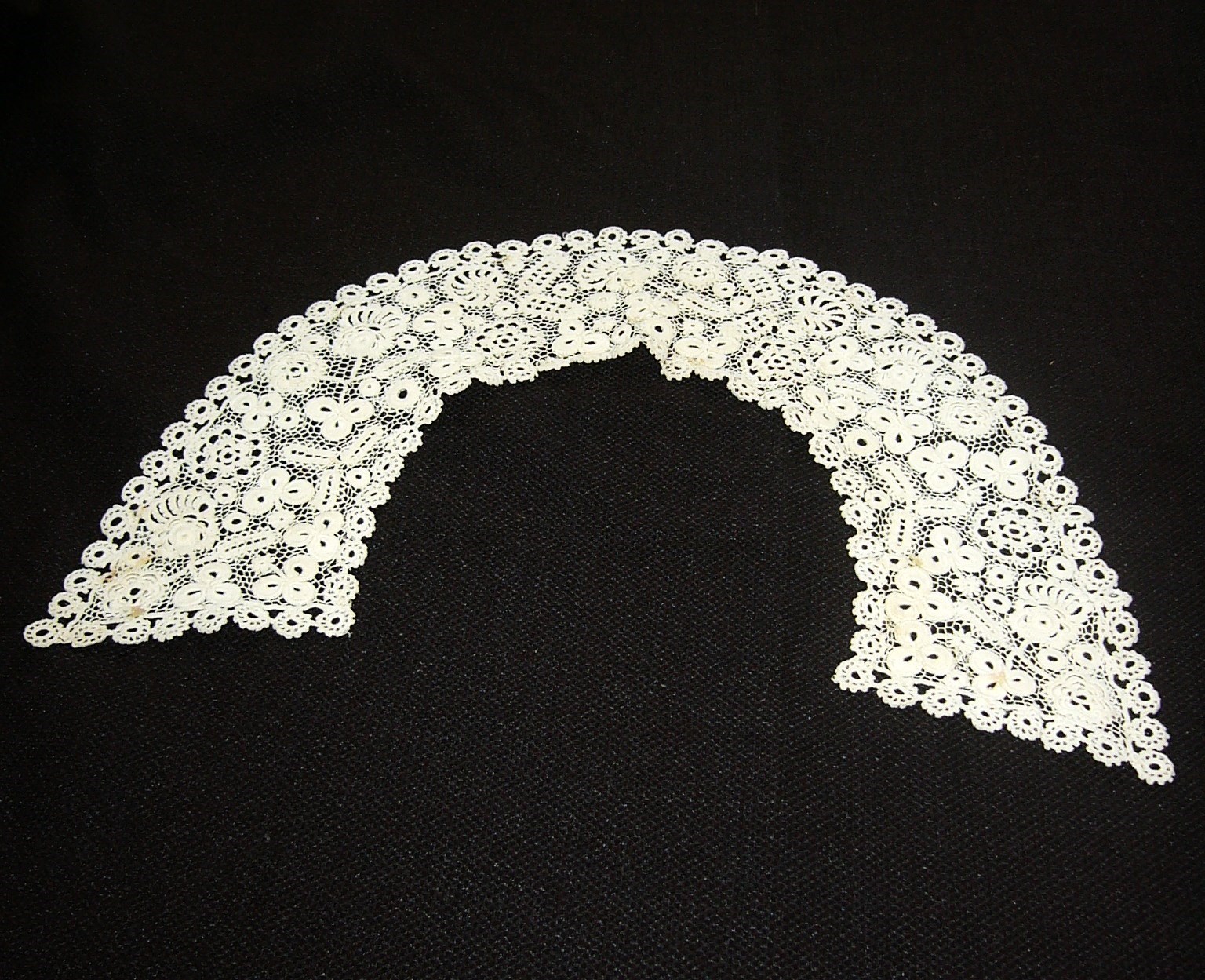 Comments: An Irish Crochet collar, ‘Point’ type with needlemade ground. The motifs are small and tightly worked, a little geometric, heavy on the shamrocks. No raised work that I can find.