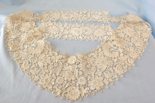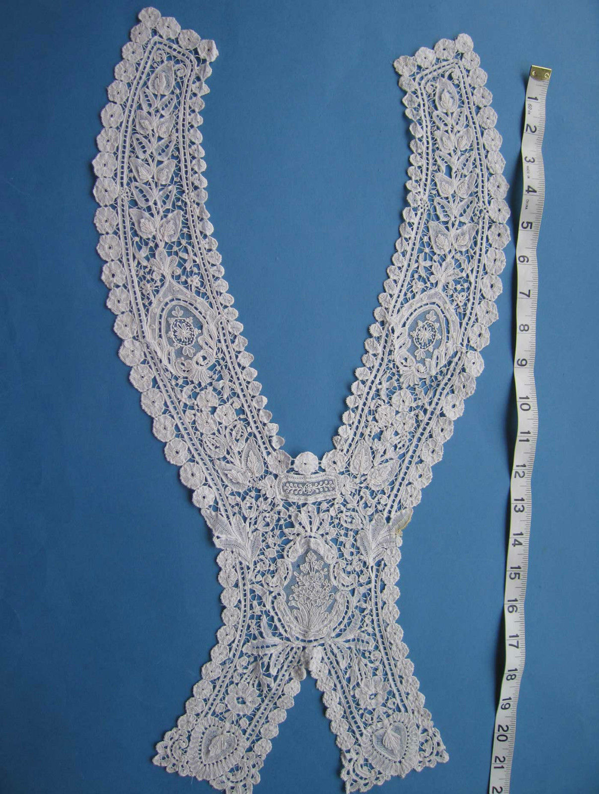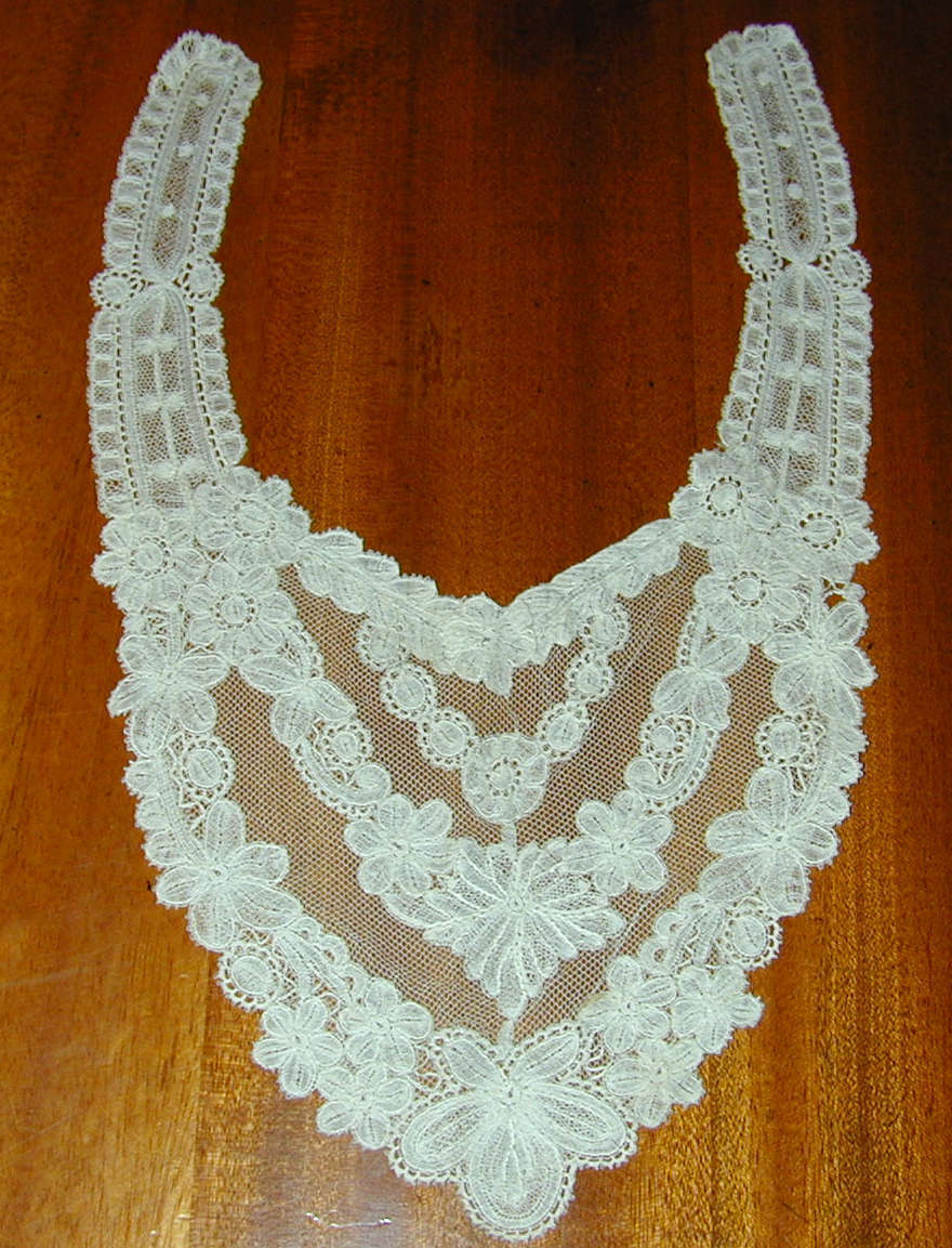 Comments: A three-layer Maltese collar. Outer is a series of flowers, along the neck is the wheat ear woven leaf vertical motif. Center is mats of woven leaves with Maltese crosses done in guipure. A typical design for a collar, well executed.