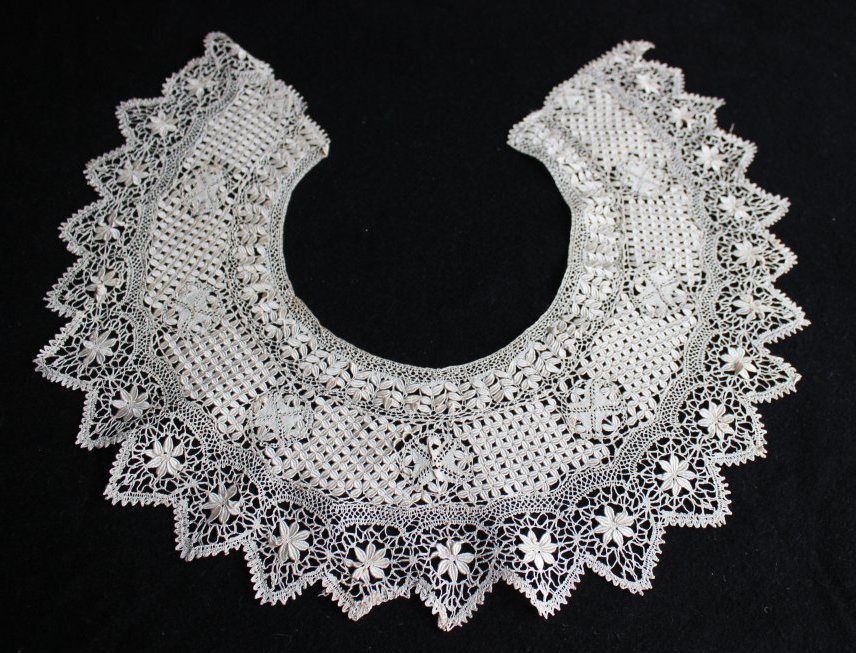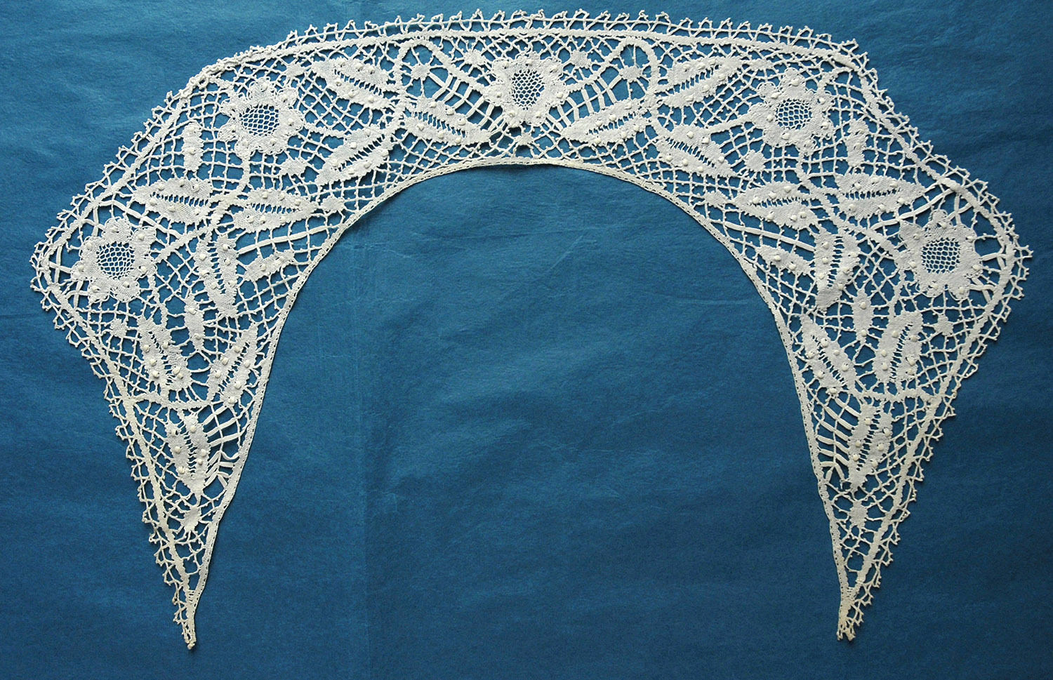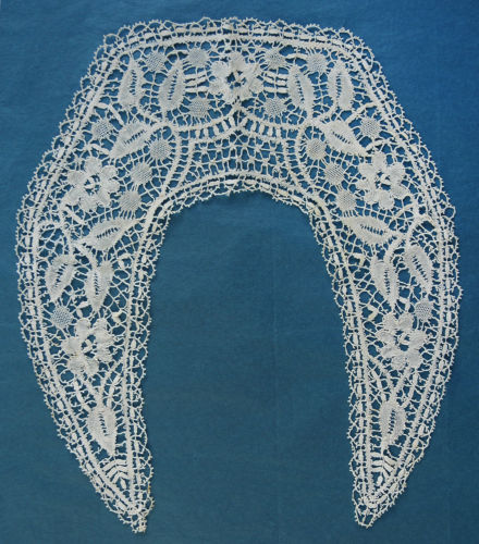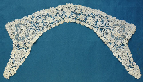 Comments: A Brussels Duchesse collar. Raised roses on the Point de Gaze inserts. Nice grid of decorative ‘mode’ stitches toward the points, unusual for a piece this small. Looks like there might be some raised work in the bobbinlace too. Nice piece, well worked.