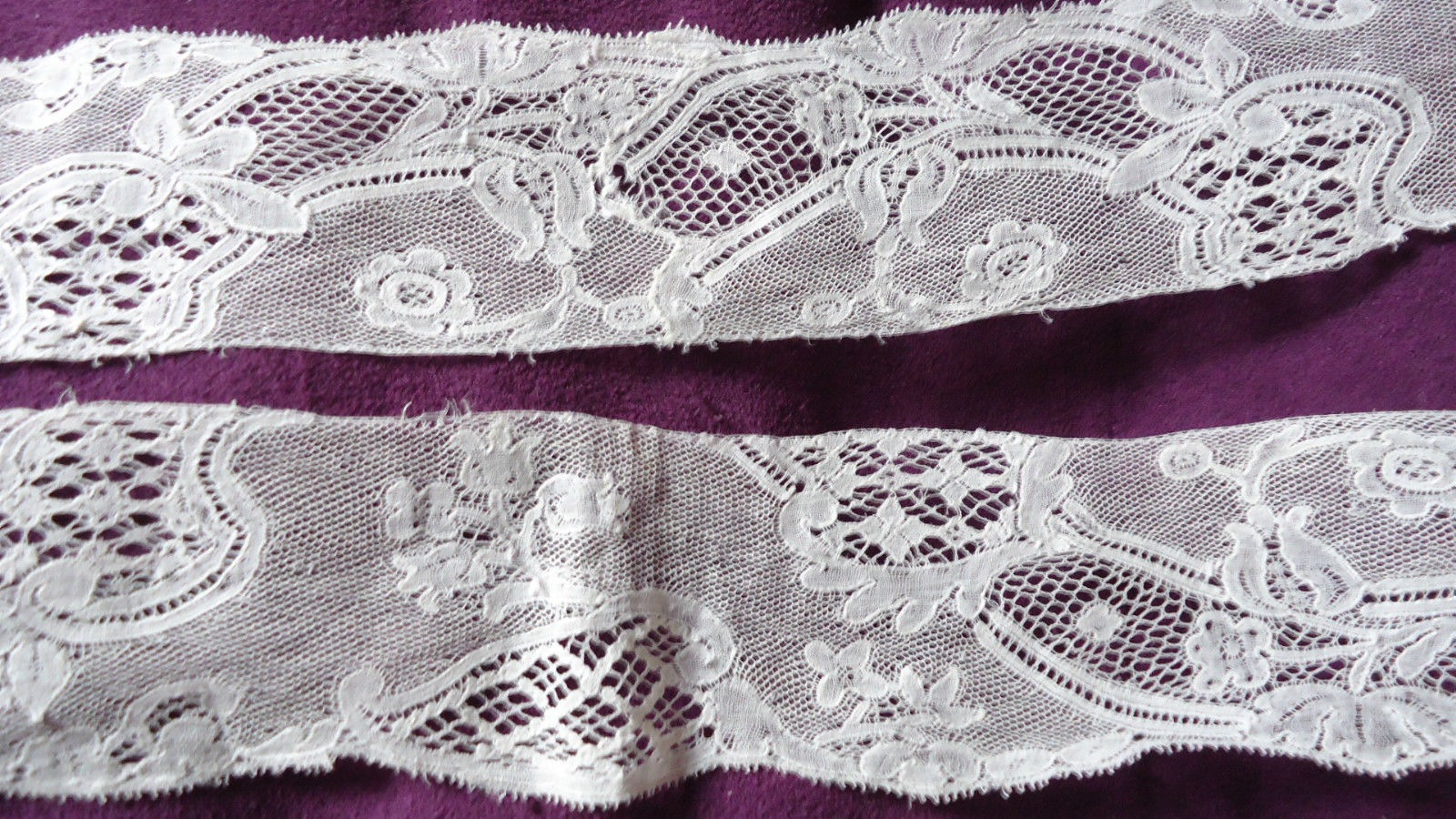 Comments: A narrow Mechlin border, Louis XV design, mid 18th c. Quatrefoil and other fillings, fairly naturalistic flowers.The undulating bands are quite wide, well filled. At only 2″ wide, I think this is more delicate than it appears in the photos.