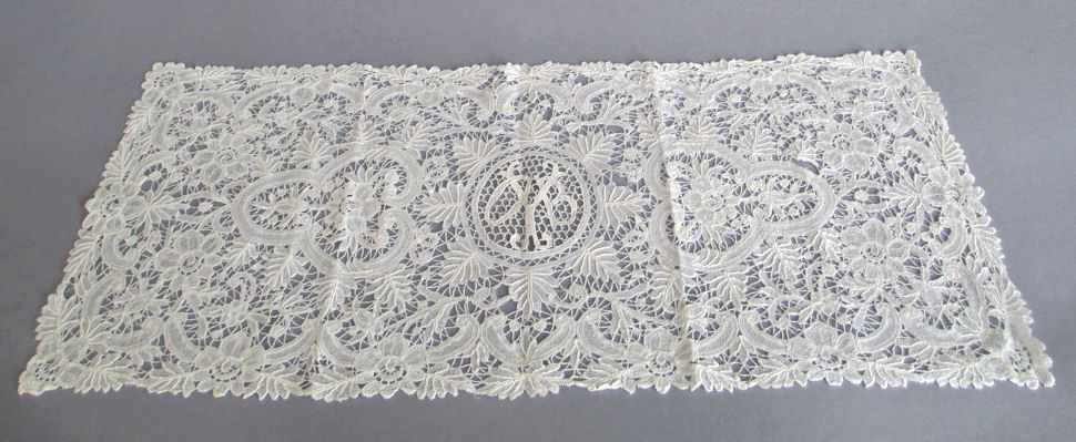 Comments: A tablepiece of Duchesse, with initialed monogram in Venise needlelace. Rolled raised work forming leaf veins. This was probably part of a wedding trousseau. There’s a lot going on in this design, rather crowded.