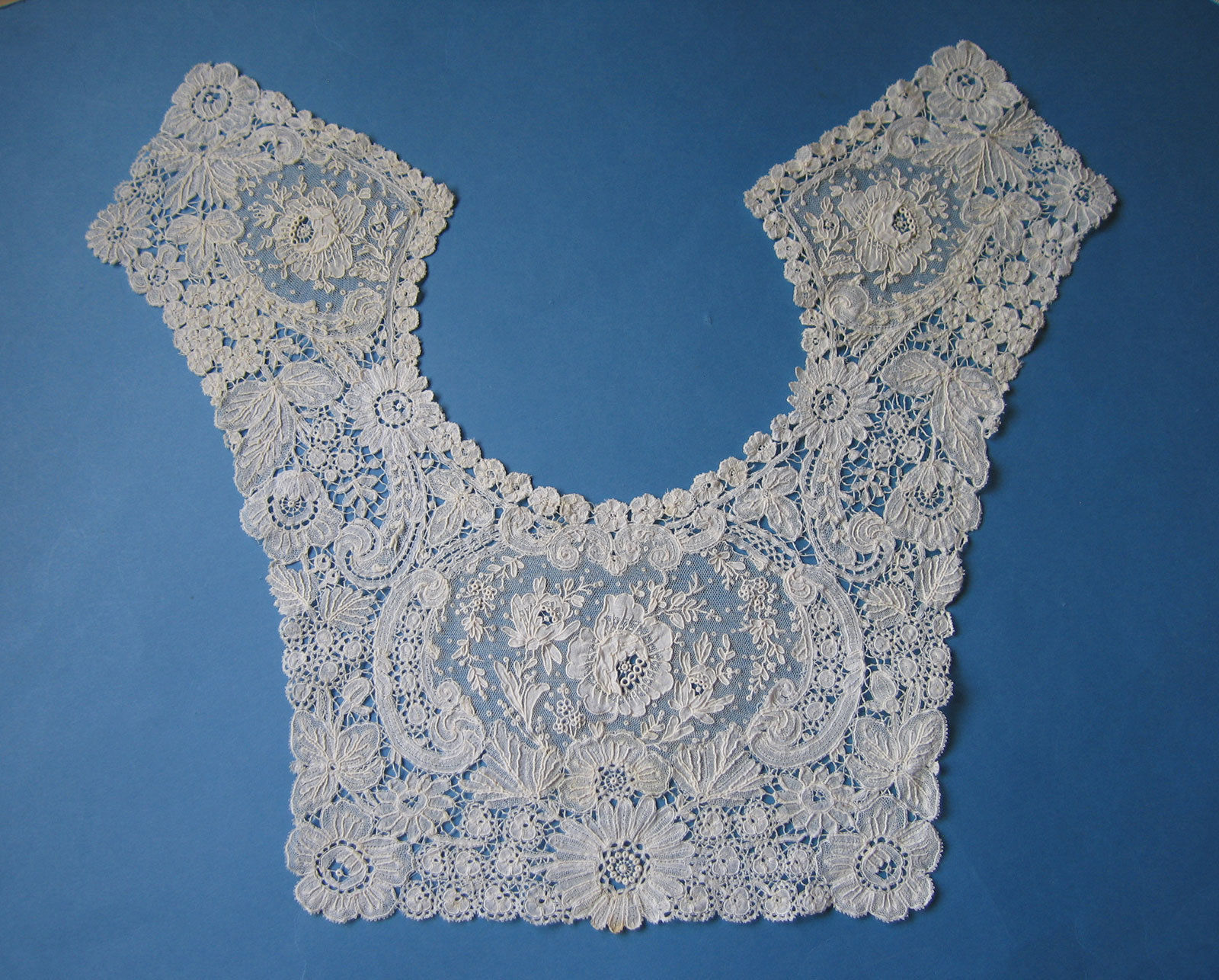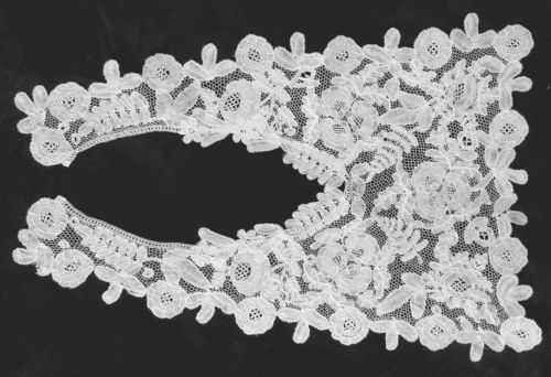 Comments: A figural Honiton Point collar, quite deep. The brides are needle-made. The flowers look like tulips, and butterflies are scattered around as if they were flying through a flower garden. The neck edge looks a little snails/slugs, but the rest is more advanced technically, probably a later piece.