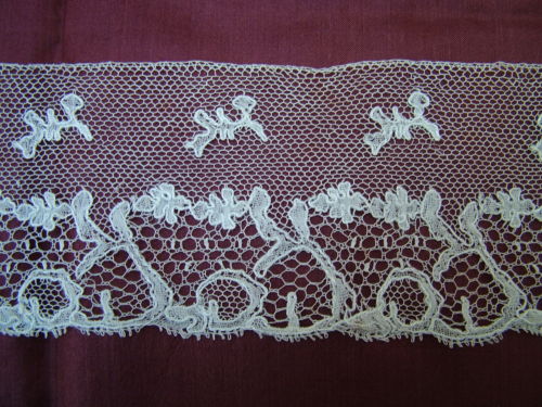 Comments: A Chantilly flounce – wide and long (which is pretty common for Chantilly borders). This one looks very dark and a little dense, which is probably a sign of Belgian manufacture. Good romantic design with alternating flower sprays and a kind of fan shaped motif with leaves on top. Lots of esprits in the ground.