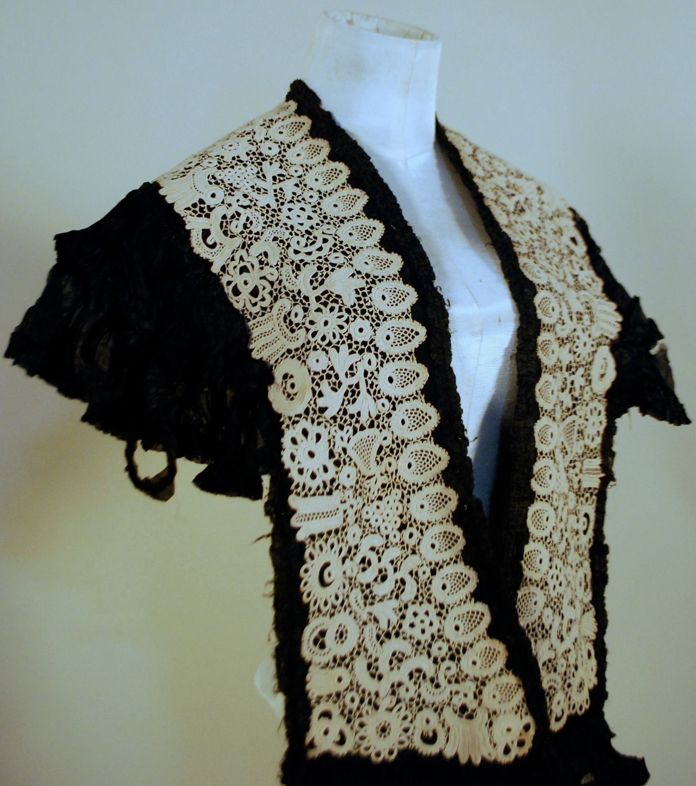 Modifications: Crochet is fitted to black silk taffeta top. I think the outside edge of the lace has been cut from a larger piece, at least on the hanging ends.